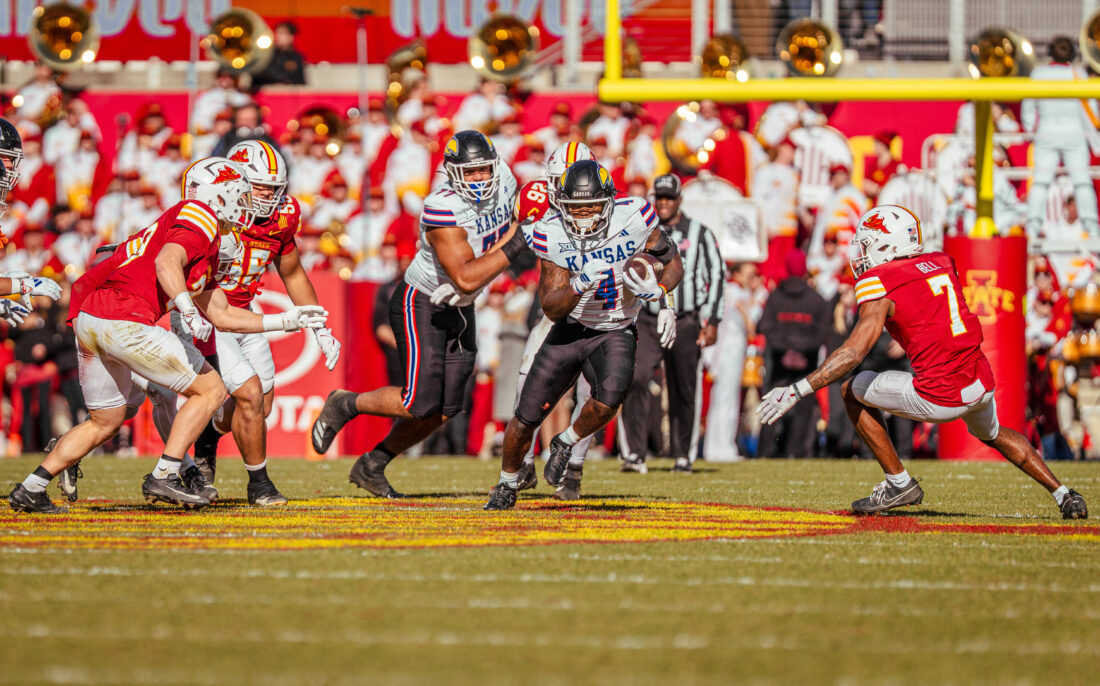 Kansas running back Leshon Williams splits the defenders for a positive gain during the game against Iowa State on Saturday, Nov. 22, 2025, in Ames, Iowa.