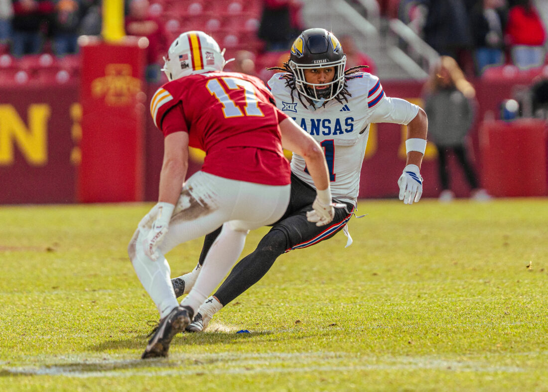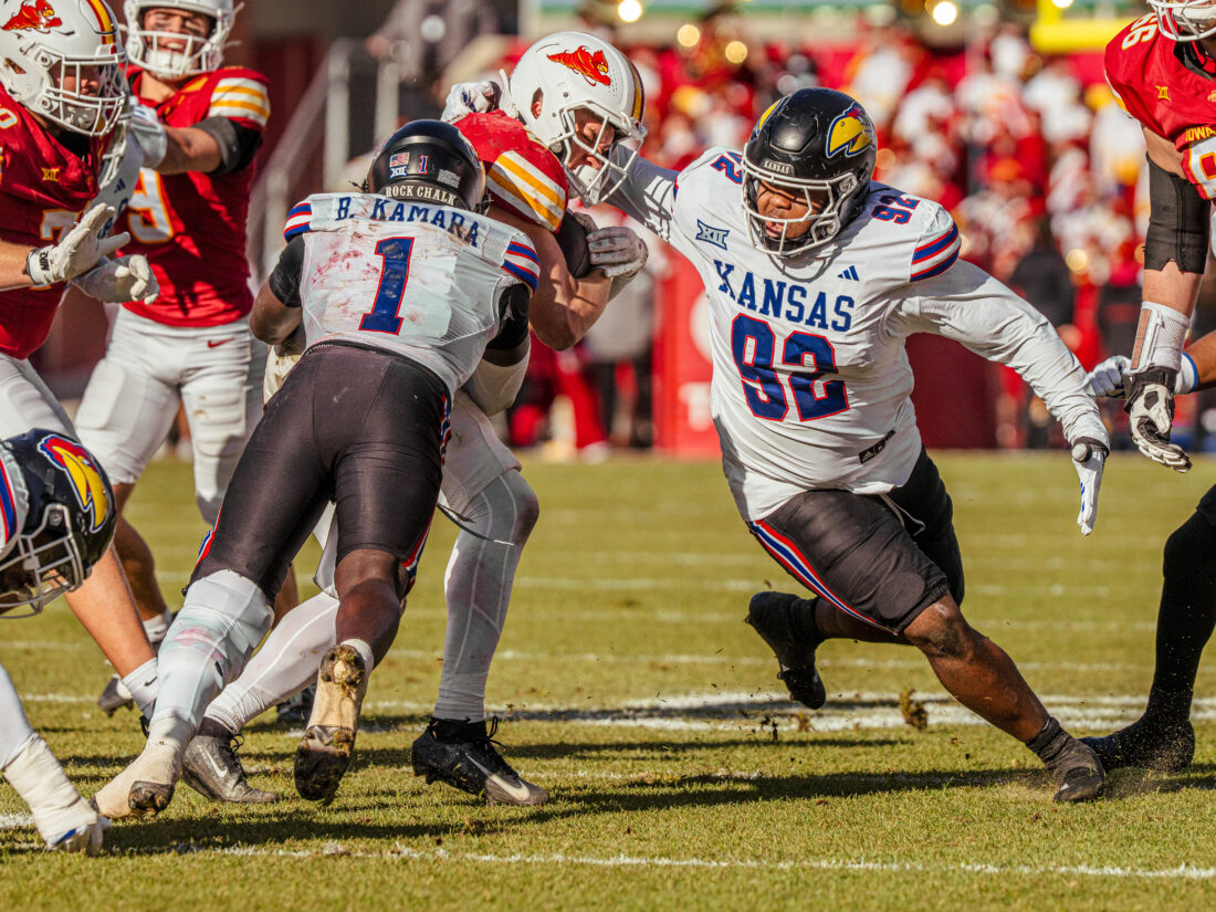 Kansas defensive end Dakyus Brinkley works to disrupt a pass during the game against Iowa State on Saturday, Nov. 22, 2025, in Ames, Iowa.