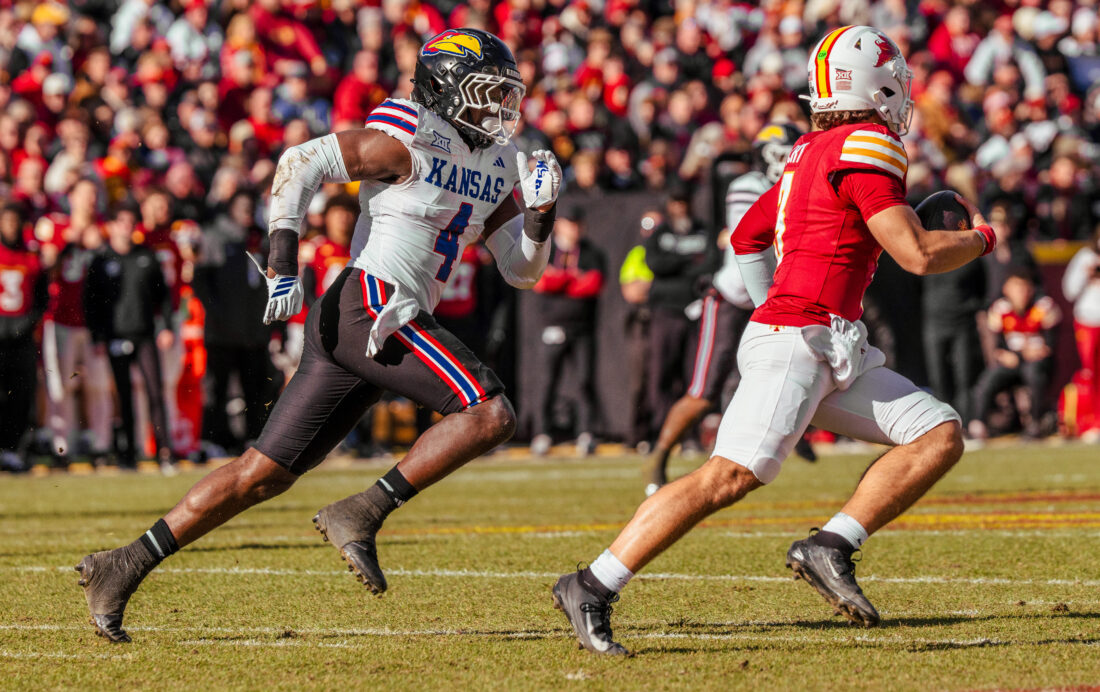 Kansas linebacker Trey Lathan chases down Iowa State quarterback Rocco Becht during the game against Iowa State on Saturday, Nov. 22, 2025, in Ames, Iowa.