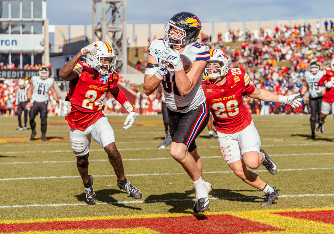 Kansas tight end Boden Groen comes down with a pass over Iowa State defensive backs Quentin Taylor Jr. and Drew Surges for a touchdown during the game against Iowa State on Saturday, Nov. 22, 2025, in Ames, Iowa.