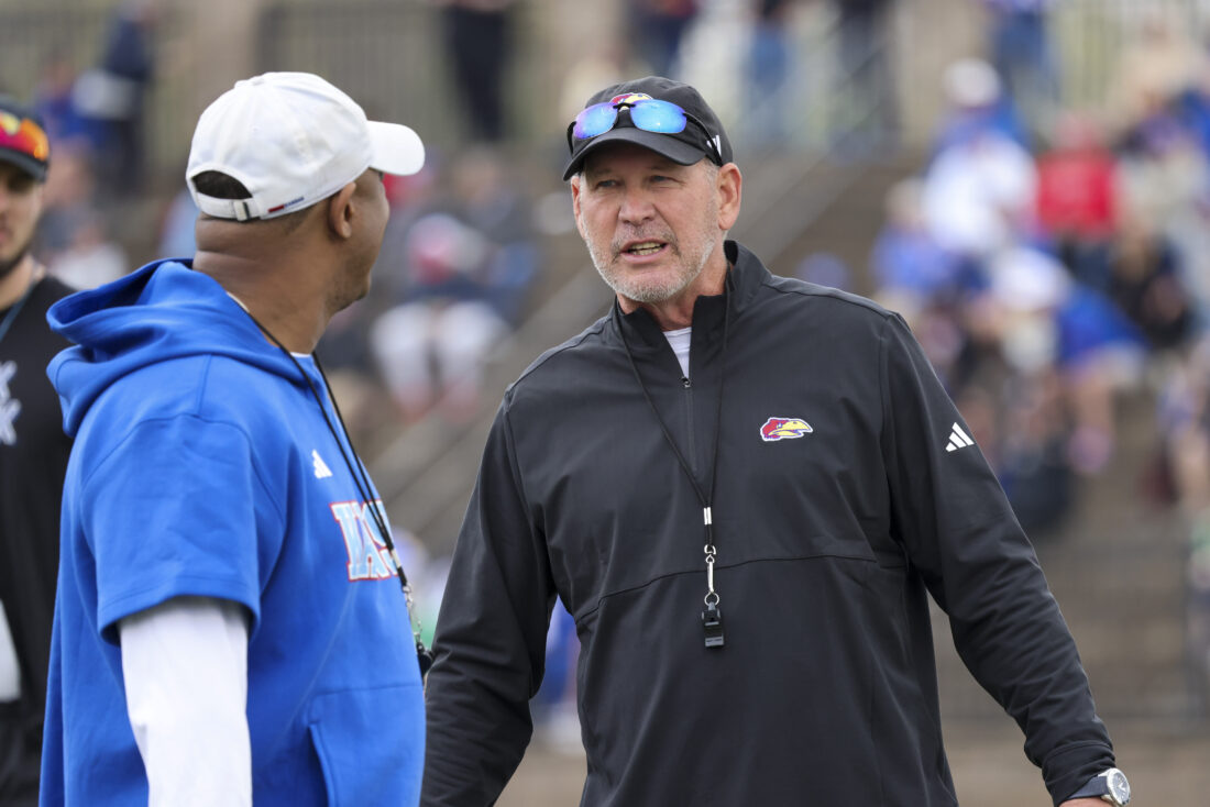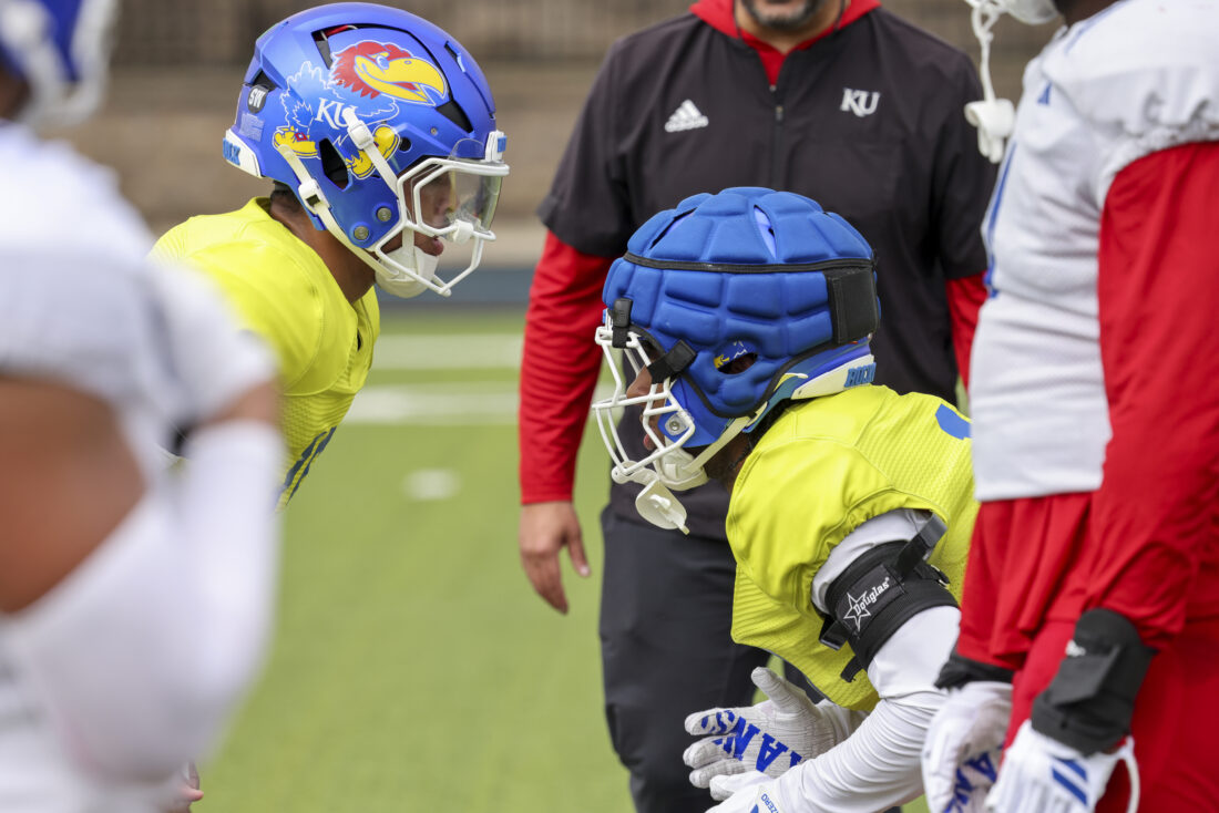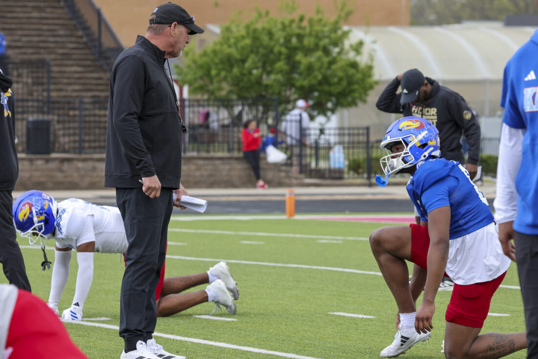 Kansas head coach Lance Leipold (left) speaks with players during KU Football’s spring practice at Lawrence High School on Saturday, April 11, 2026 in Lawrence.