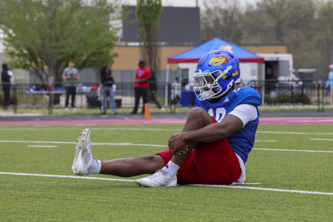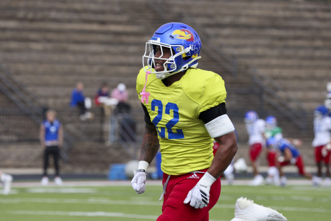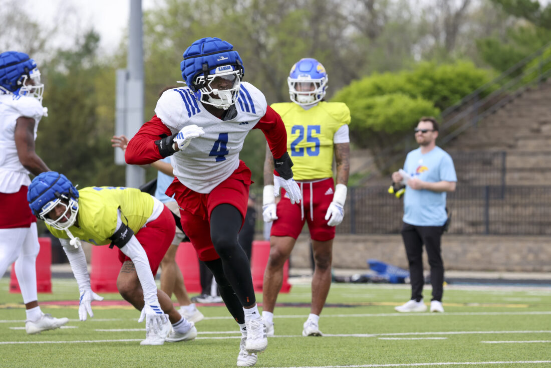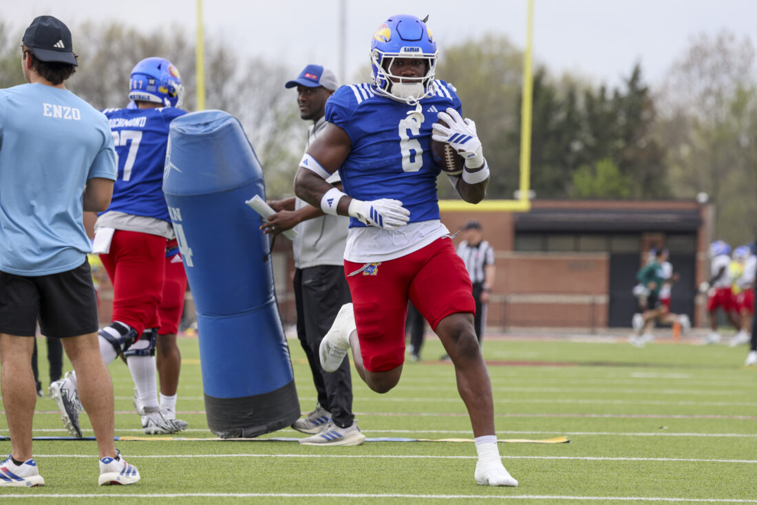 Kansas running back Dylan Edwards participates in KU Football’s spring practice at Lawrence High School on Saturday, April 11, 2026 in Lawrence.