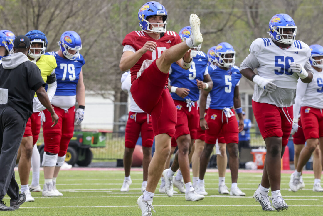 Kansas receiver Tate Nagy works on returns during KU Football’s spring practice at Lawrence High School on Saturday, April 11, 2026 in Lawrence.