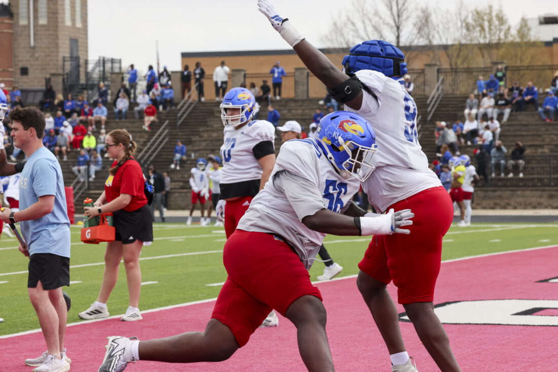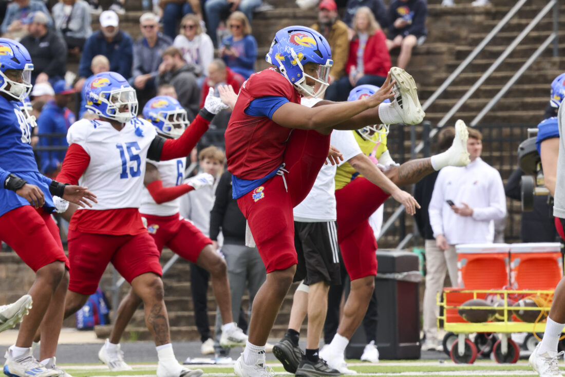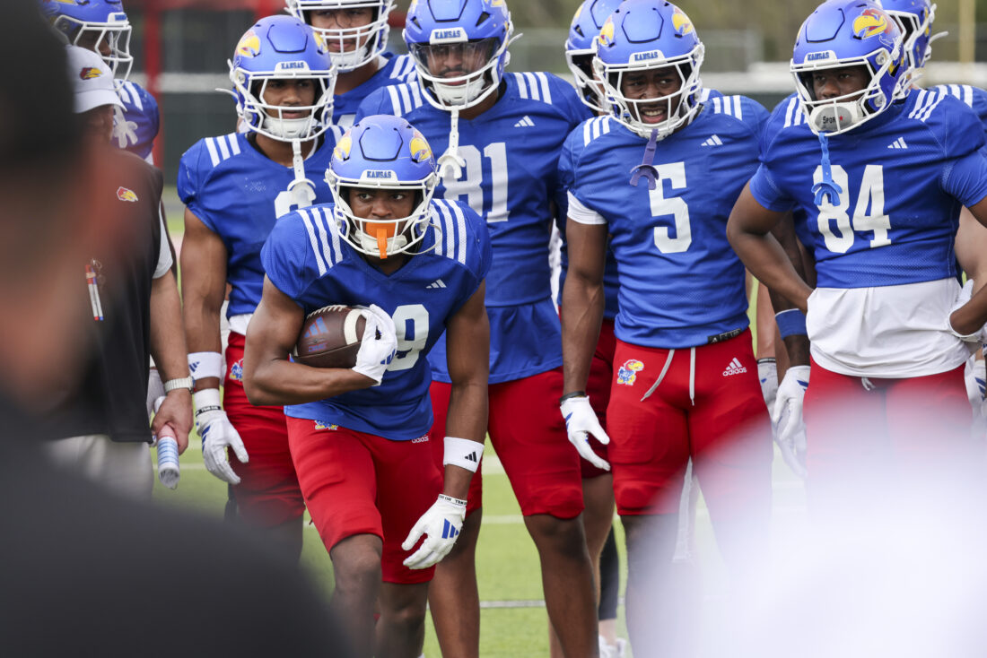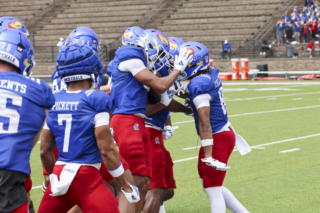 Kansas receiver Donald Collier (right) is swarmed by teammates during KU Football’s spring practice at Lawrence High School on Saturday, April 11, 2026 in Lawrence.
