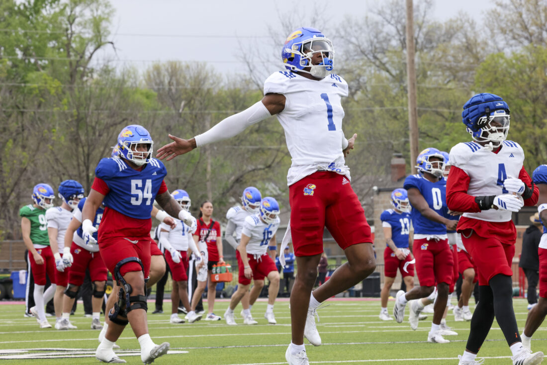 Kansas receiver Nate Sims participates in a drill during KU Football’s spring practice at Lawrence High School on Saturday, April 11, 2026 in Lawrence.