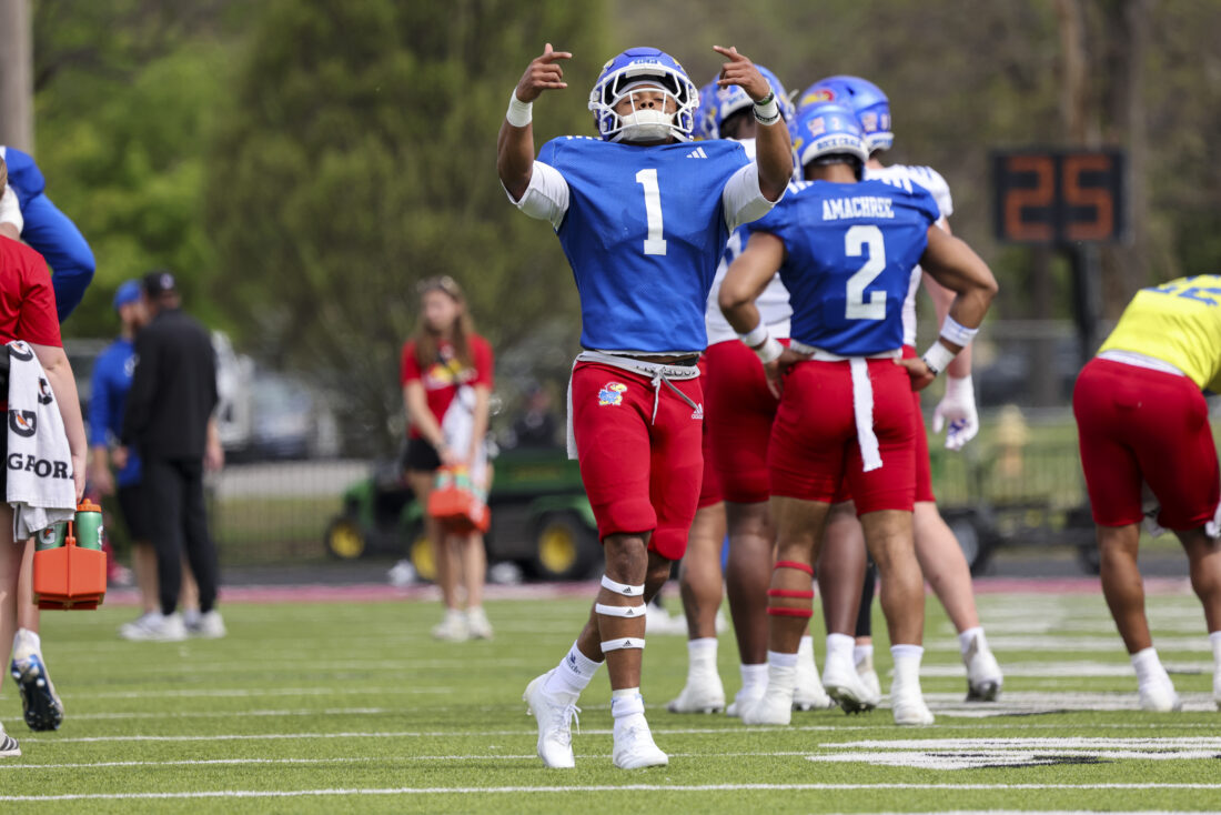 Kansas running back Dylan Edwards signals to the camera during KU Football’s spring practice at Lawrence High School on Saturday, April 11, 2026 in Lawrence.