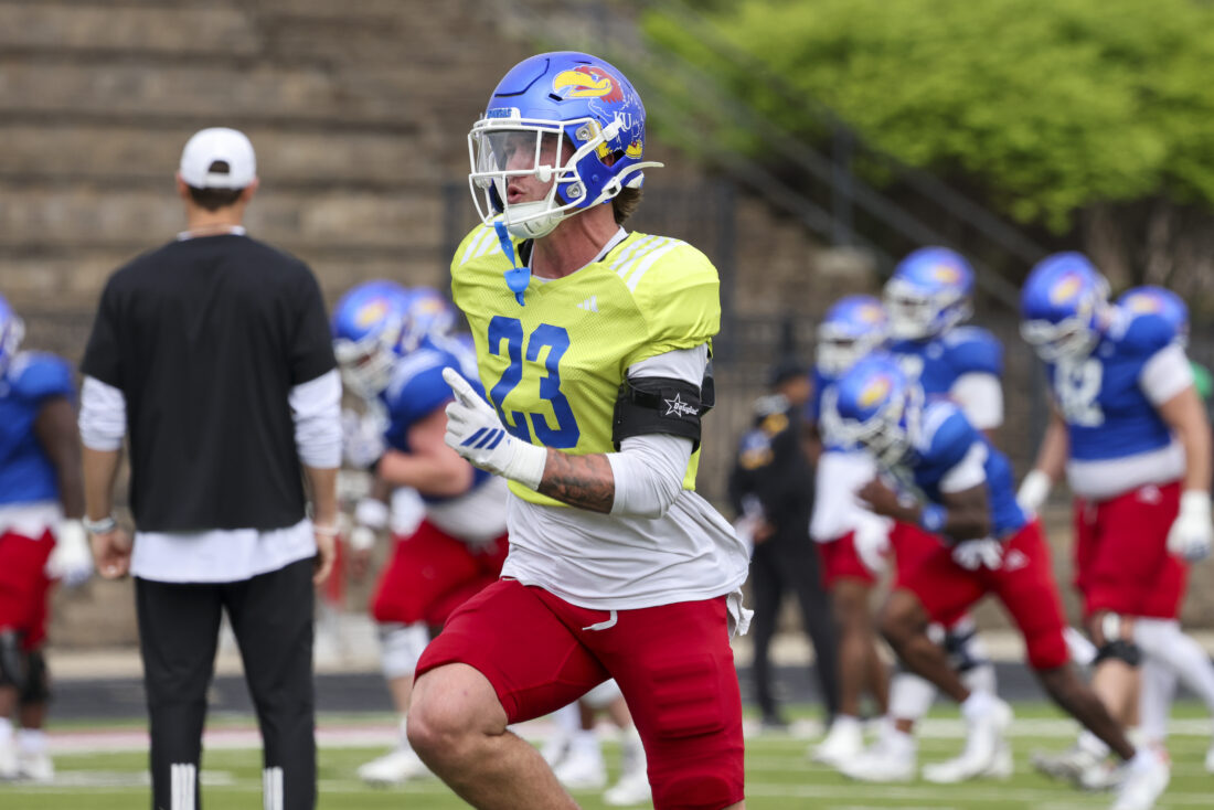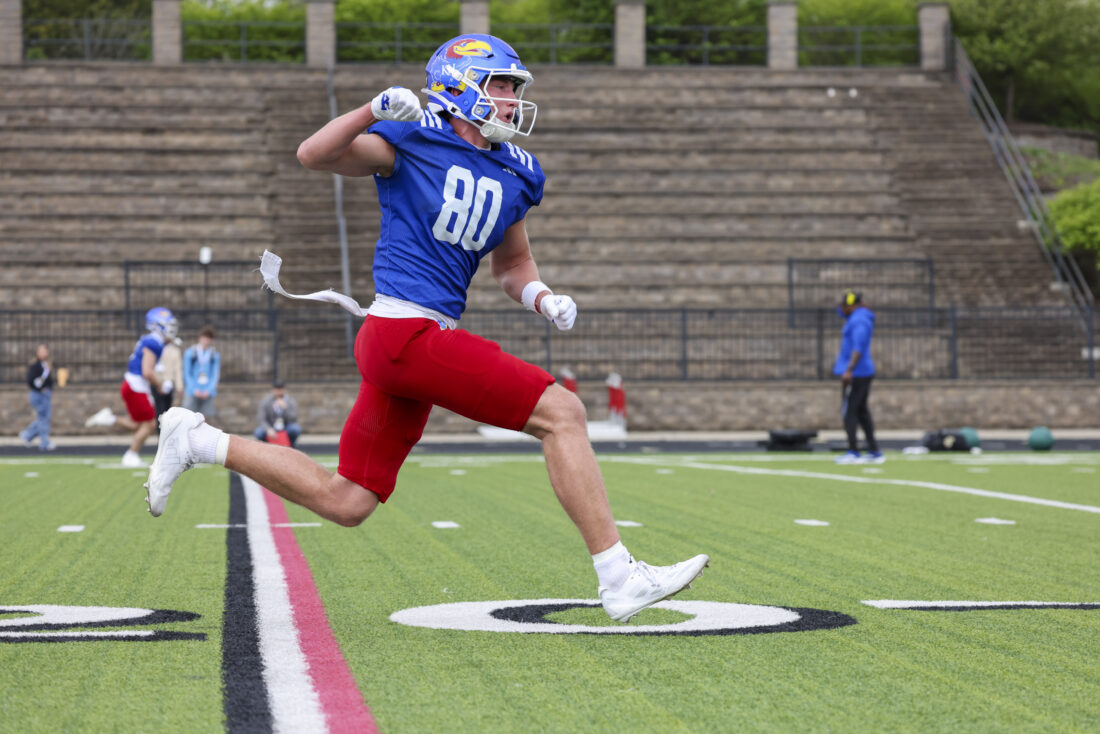 Kansas receiver Griffin Baker changes directions during KU Football’s spring practice at Lawrence High School on Saturday, April 11, 2026 in Lawrence.