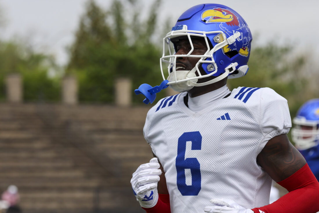 Kansas cornerback Jahlil Hurley smiles during KU Football’s spring practice at Lawrence High School on Saturday, April 11, 2026 in Lawrence.