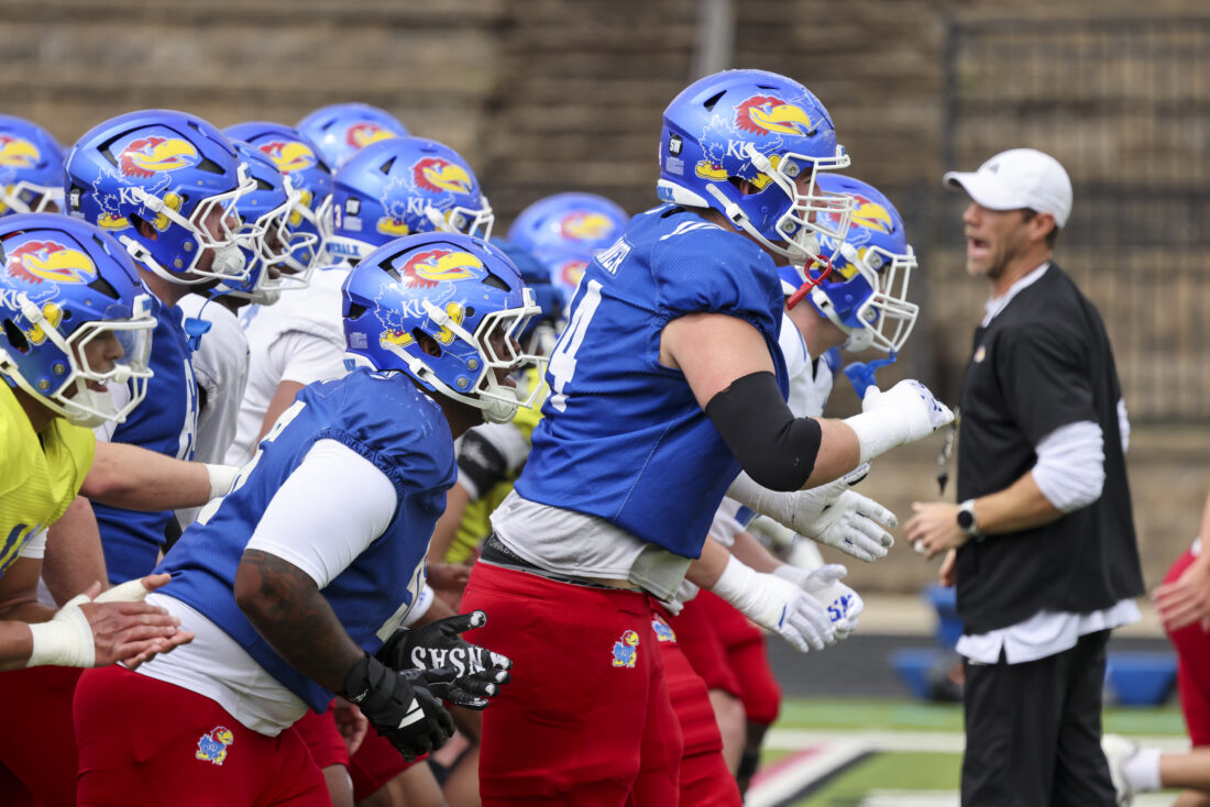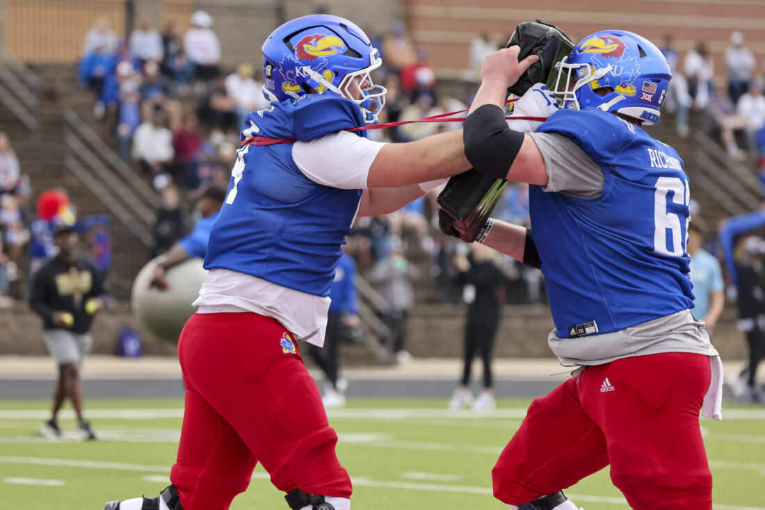 Kansas offensive lineman Kaden Snyder (left) and Eli Richmond participate in KU Football’s spring practice at Lawrence High School on Saturday, April 11, 2026 in Lawrence.