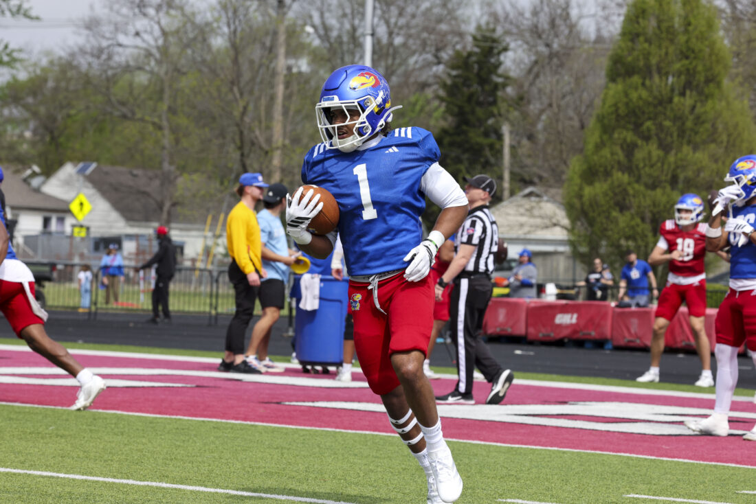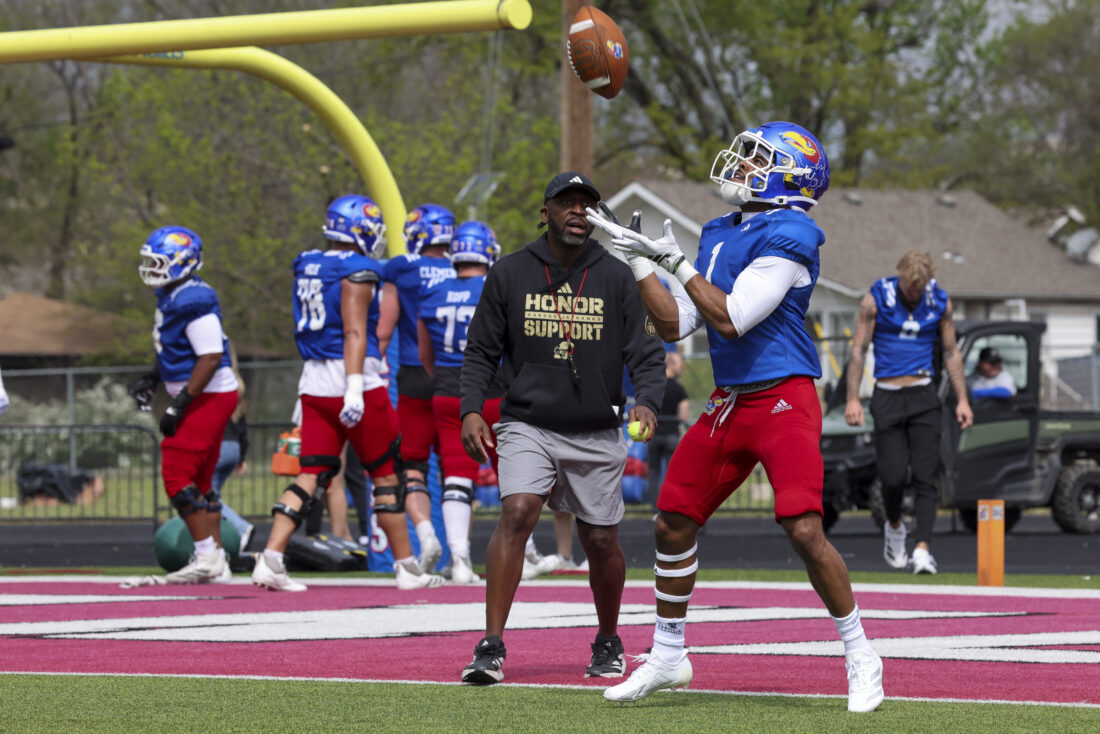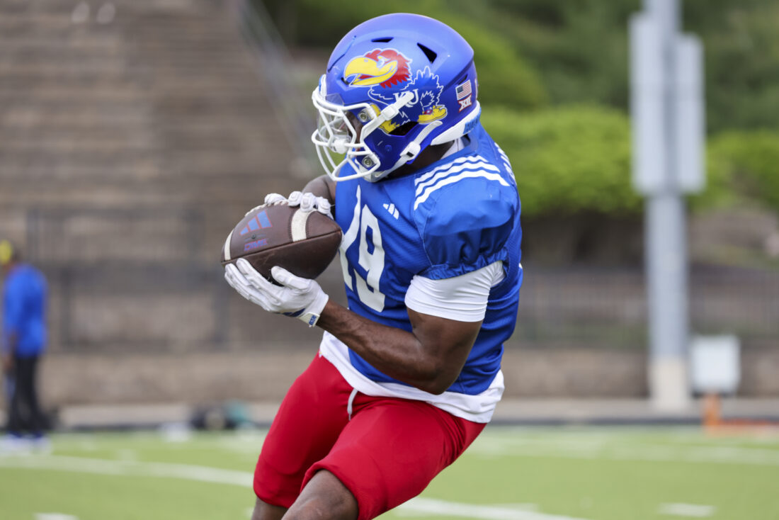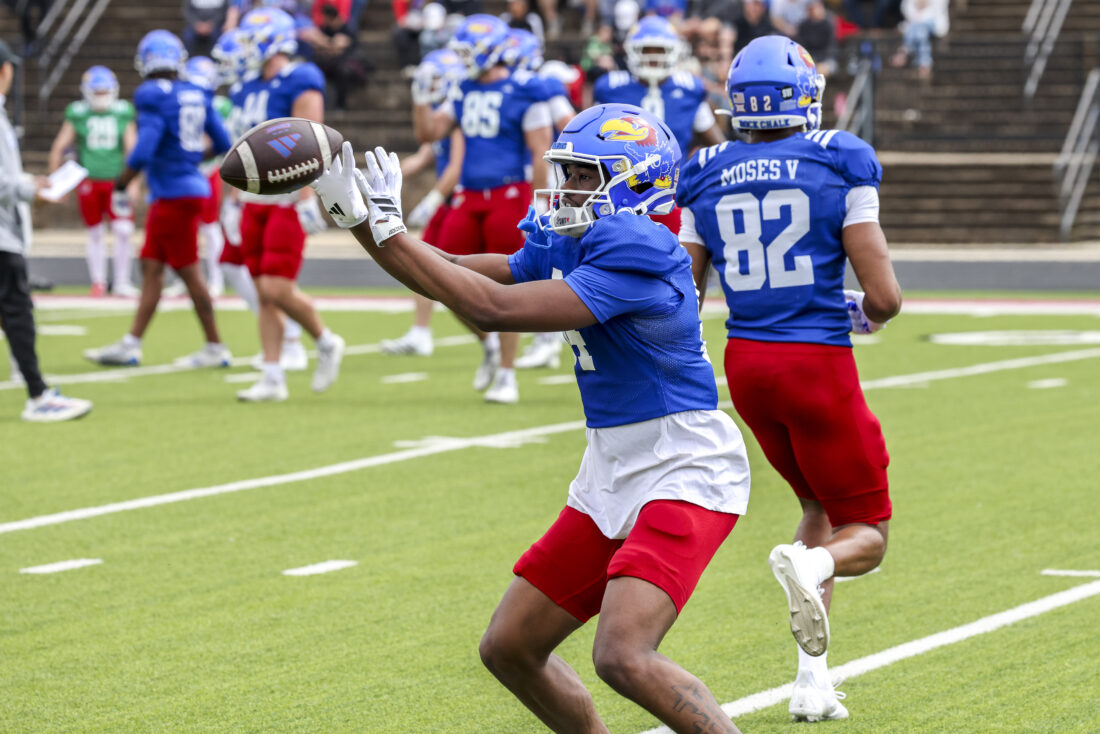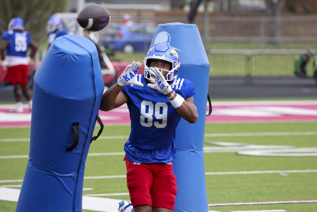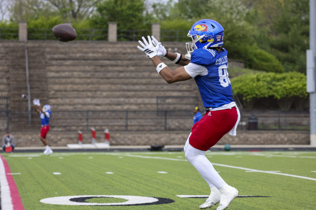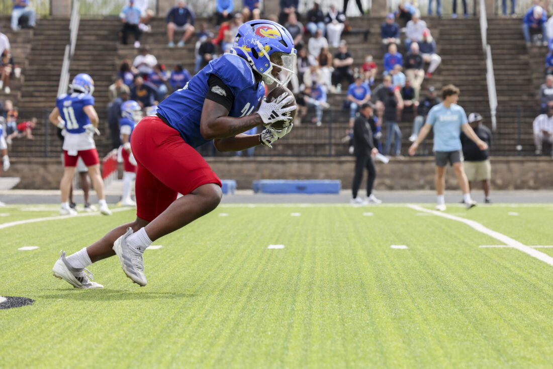 Kansas receiver Donald Collier brings in a pass during KU Football’s spring practice at Lawrence High School on Saturday, April 11, 2026 in Lawrence.