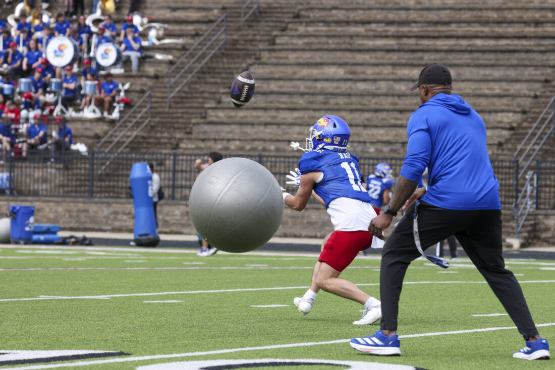 Kansas receiver Cam Pickett decides to let a ball roll out of bounds during KU Football’s spring practice at Lawrence High School on Saturday, April 11, 2026 in Lawrence.