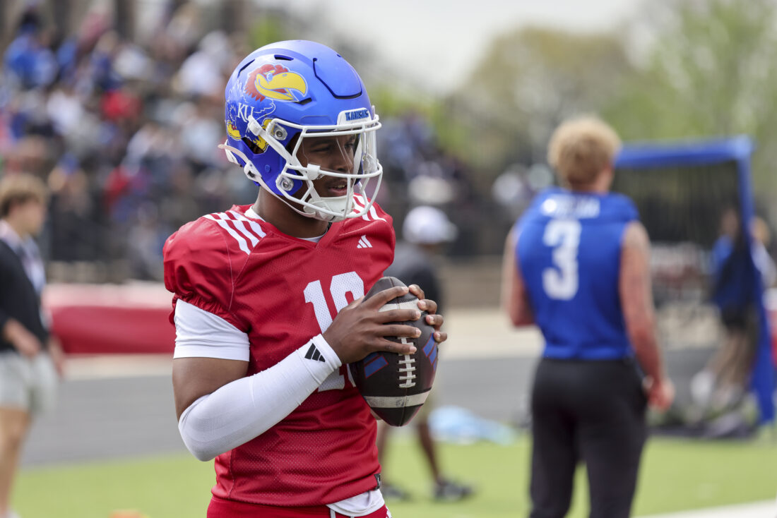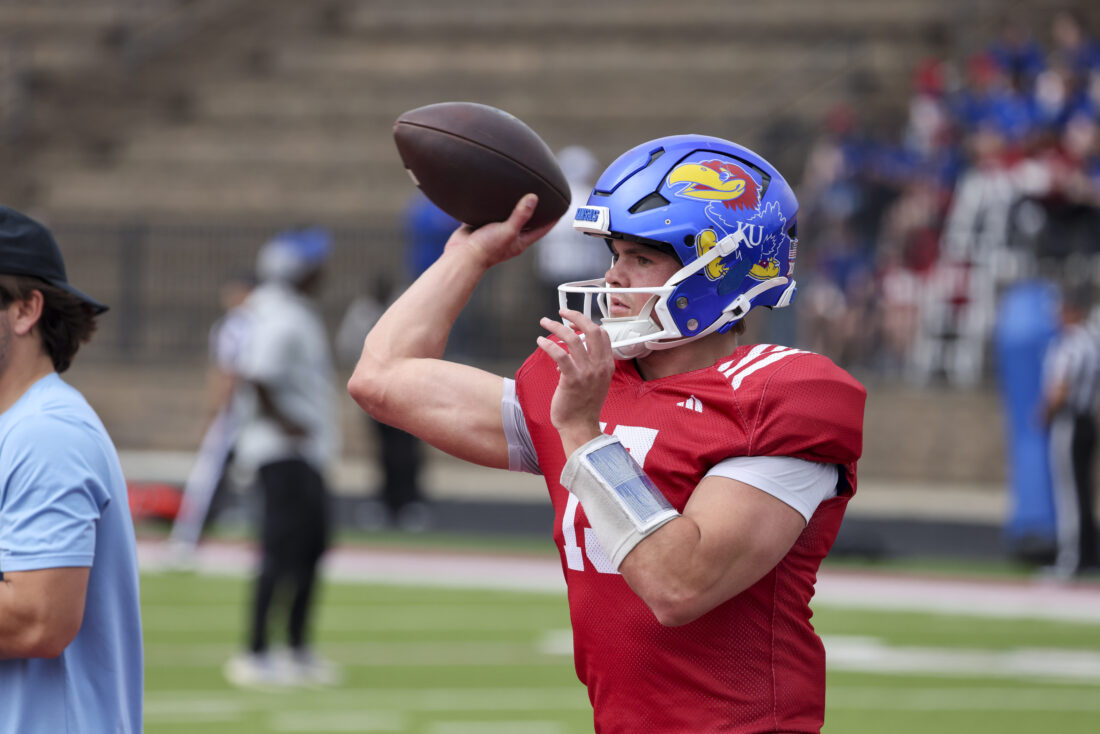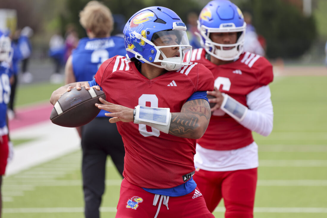 Kansas quarterback Chase Jenkins participates in KU Football’s spring practice at Lawrence High School on Saturday, April 11, 2026 in Lawrence.