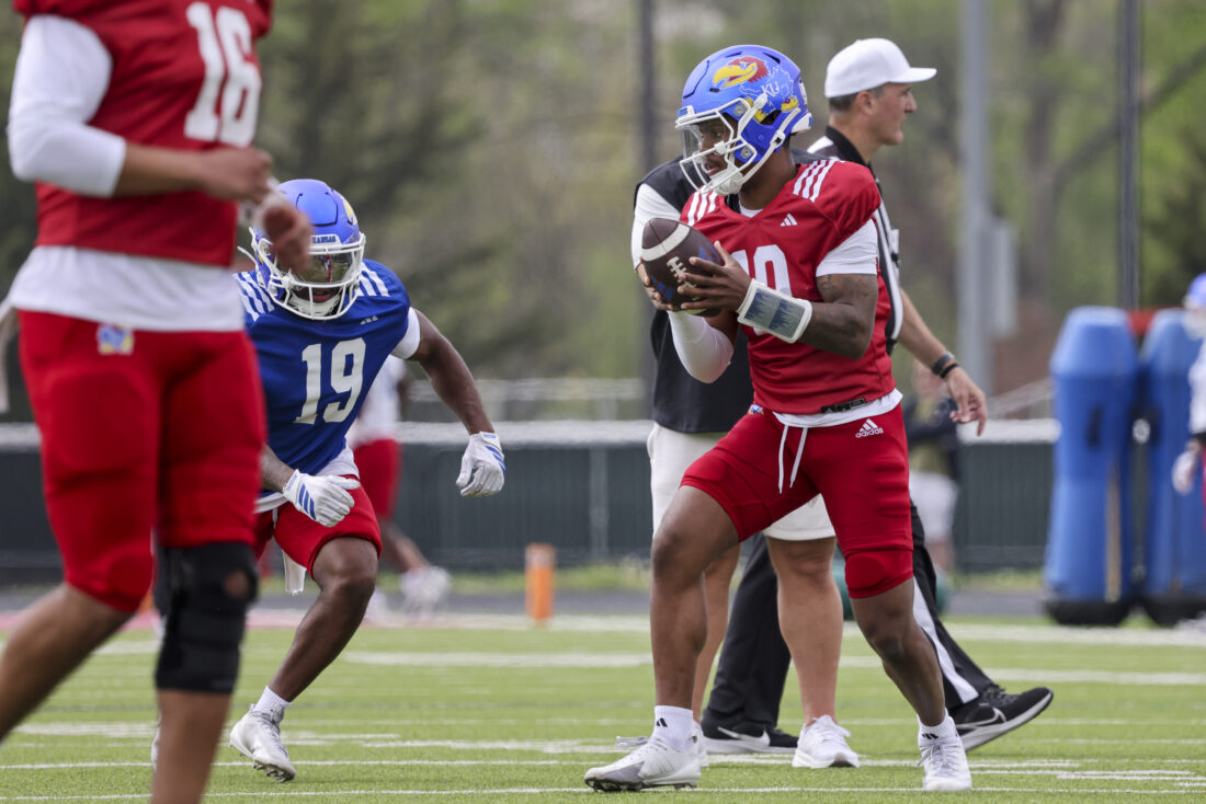 Kansas quarterback Braylen Rooney looks for space during KU Football’s spring practice at Lawrence High School on Saturday, April 11, 2026 in Lawrence.