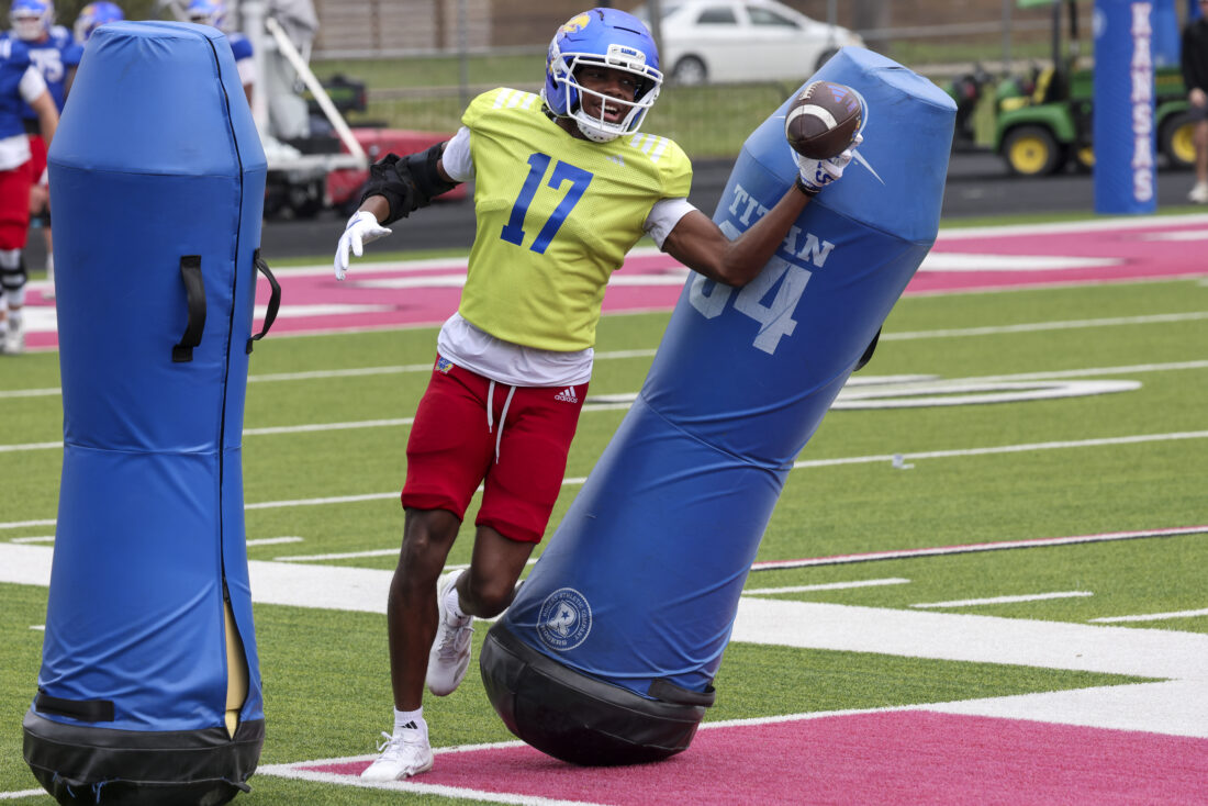 Kansas receiver Nik McMillan participates in KU Football’s spring practice at Lawrence High School on Saturday, April 11, 2026 in Lawrence.