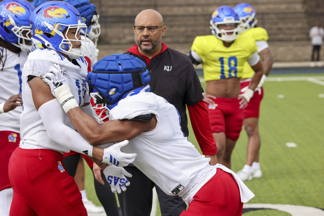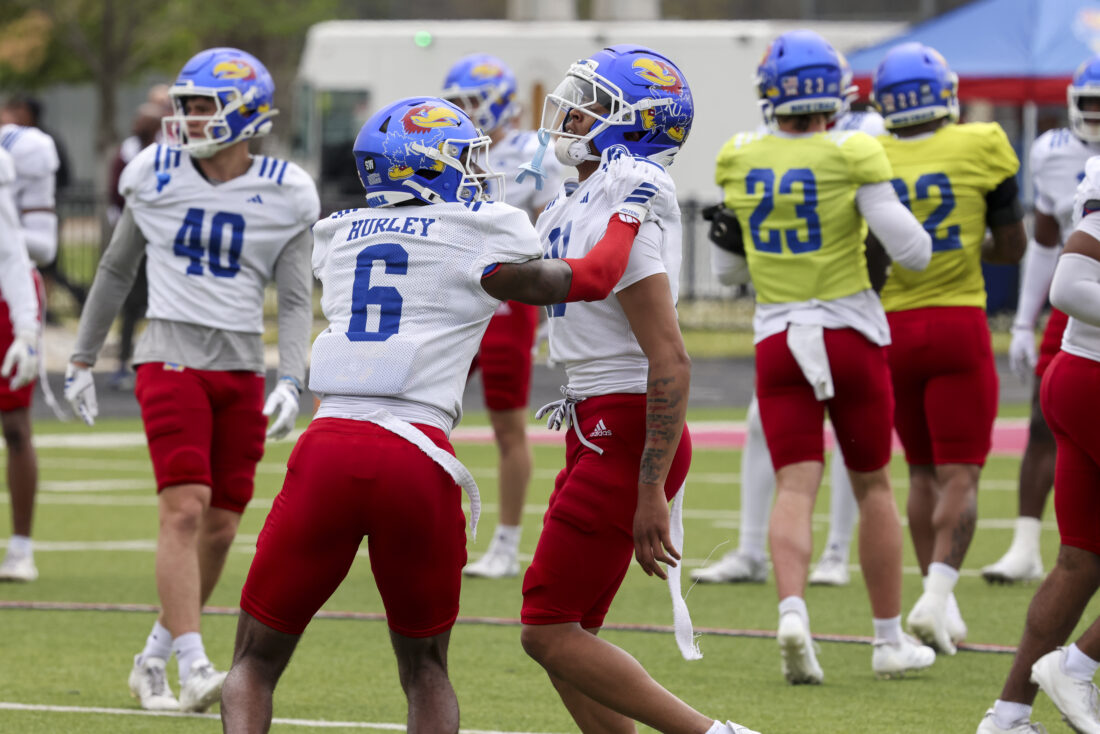 Kansas cornerback Jahlil Hurley and linebacker Landyn Watson participate in KU Football’s spring practice at Lawrence High School on Saturday, April 11, 2026 in Lawrence.