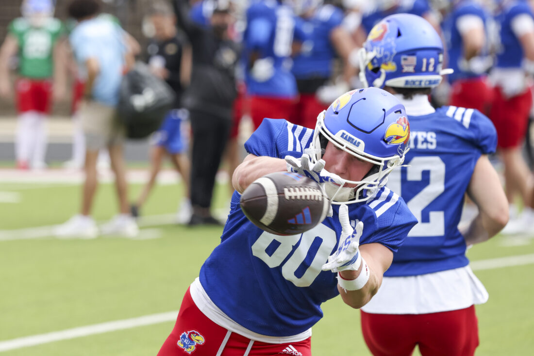 Kansas receiver Griffin Baker receives a pass during KU Football’s spring practice at Lawrence High School on Saturday, April 11, 2026 in Lawrence.