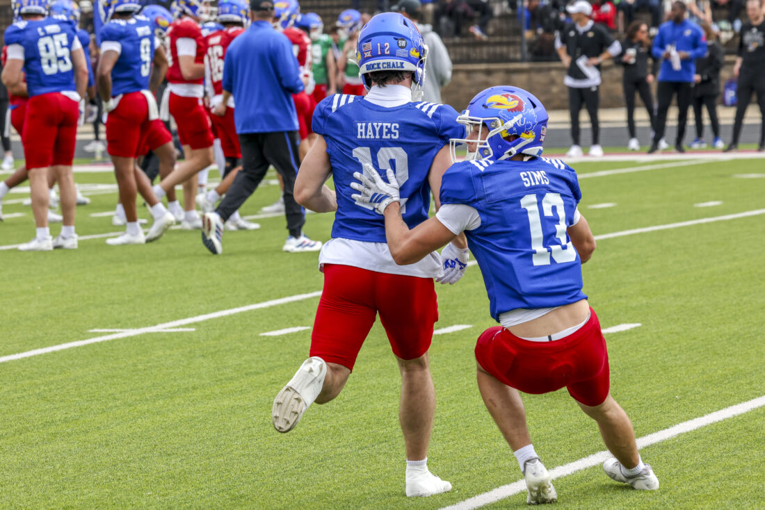 Kansas quarterback Chase Jenkins (right) goes to hand off the ball to receiver Corbin Glasco during KU Football’s spring practice at Lawrence High School on Saturday, April 11, 2026 in Lawrence.