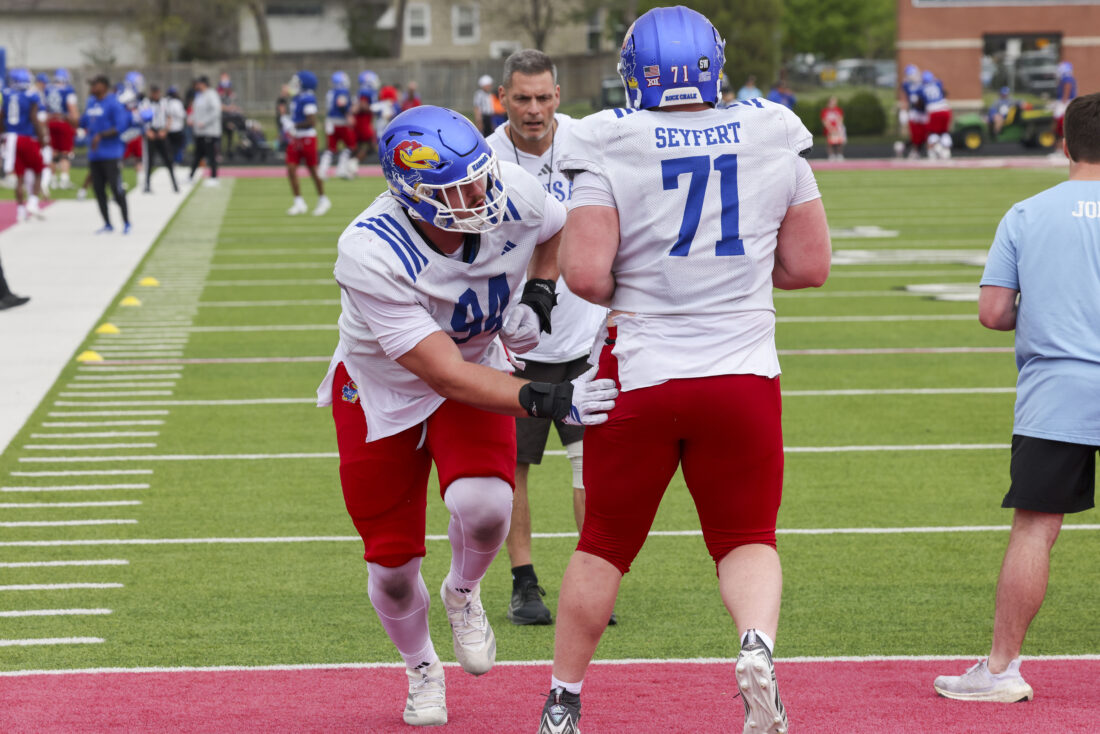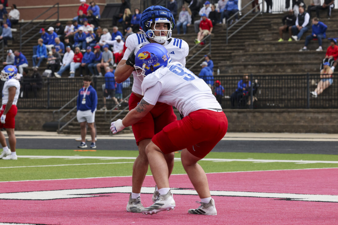 Kansas defensive linemen Blake Herold (left) and Grady Seyfert participate in a drill during KU Football’s spring practice at Lawrence High School on Saturday, April 11, 2026 in Lawrence.