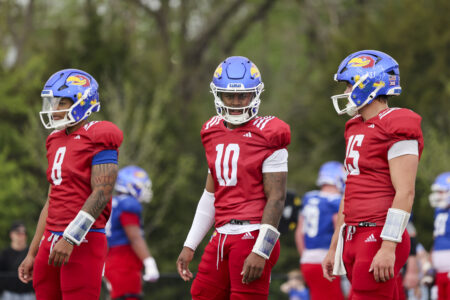 Kansas quarterbacks Isaiah Marshall, Chase Jenkins, and Cole Ballard (left to right) wait to throw during KU Football's spring practice at Lawrence High School on Saturday, April 11, 2026 in Lawrence.