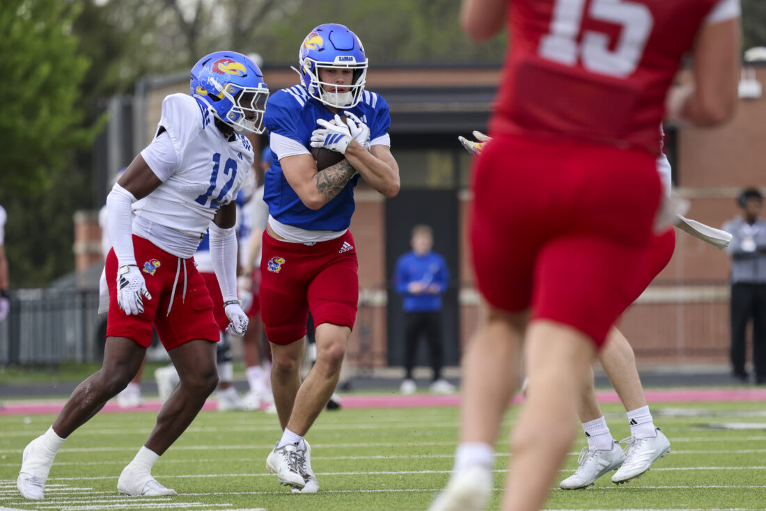 Kansas receiver Nate Sims (right) pushes off of teammate Bryson Hayes during KU Football’s spring practice at Lawrence High School on Saturday, April 11, 2026 in Lawrence.