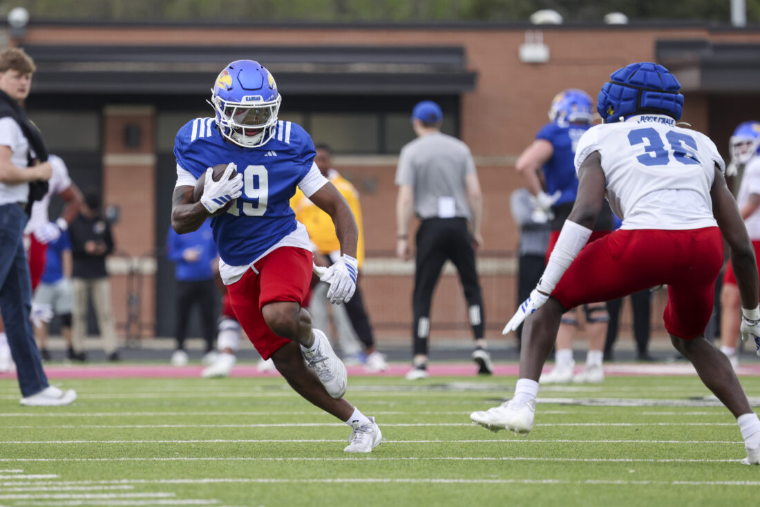 Kansas receiver Corbin Glasco looks to avoid cornerback Jameer Moore during KU Football’s spring practice at Lawrence High School on Saturday, April 11, 2026 in Lawrence.