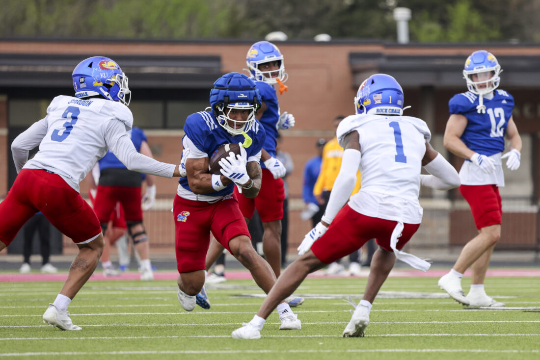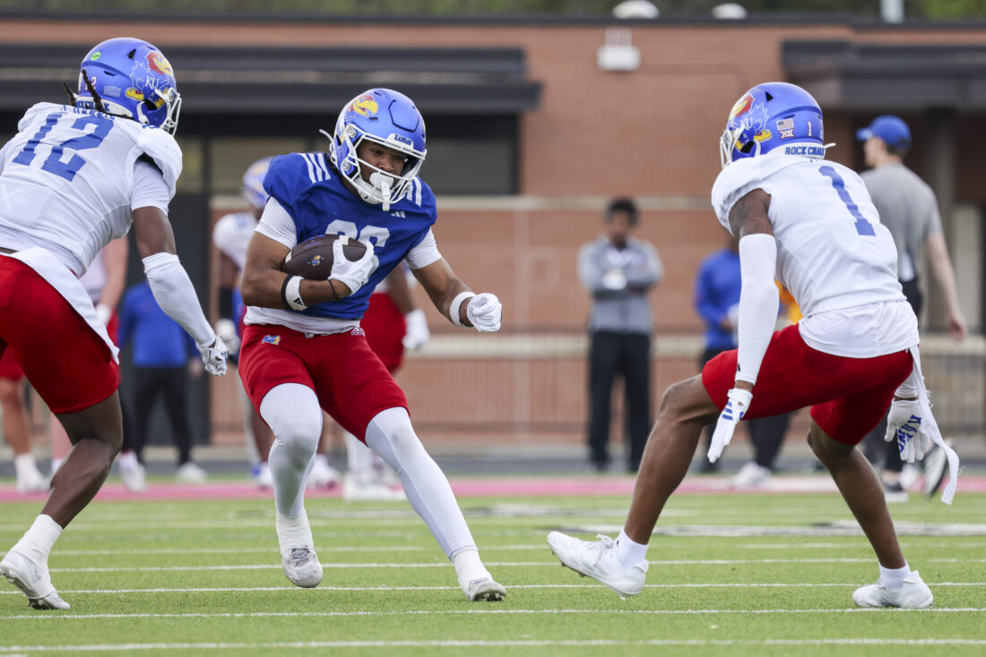 Kansas receiver Jackson Cook (center) looks to escape from safety Jaden Harris (left) and cornerback Jalen Todd during KU Football’s spring practice at Lawrence High School on Saturday, April 11, 2026 in Lawrence.