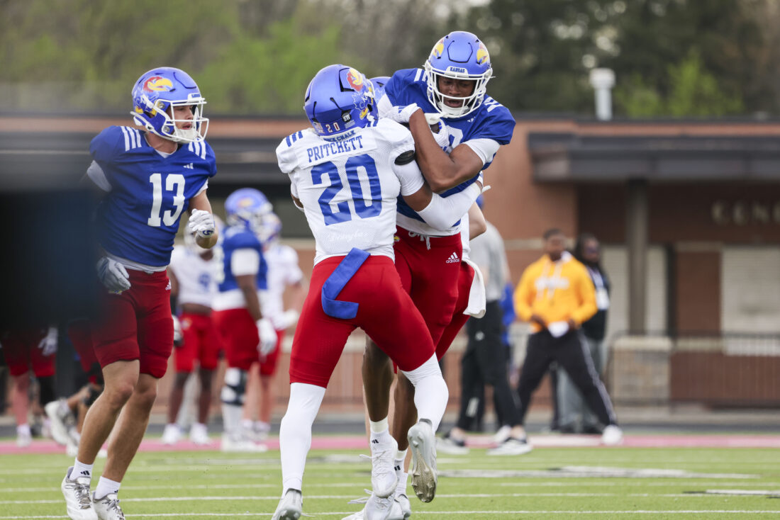 Kansas safety Christian Pritchett makes a tackle during KU Football’s spring practice at Lawrence High School on Saturday, April 11, 2026 in Lawrence.
