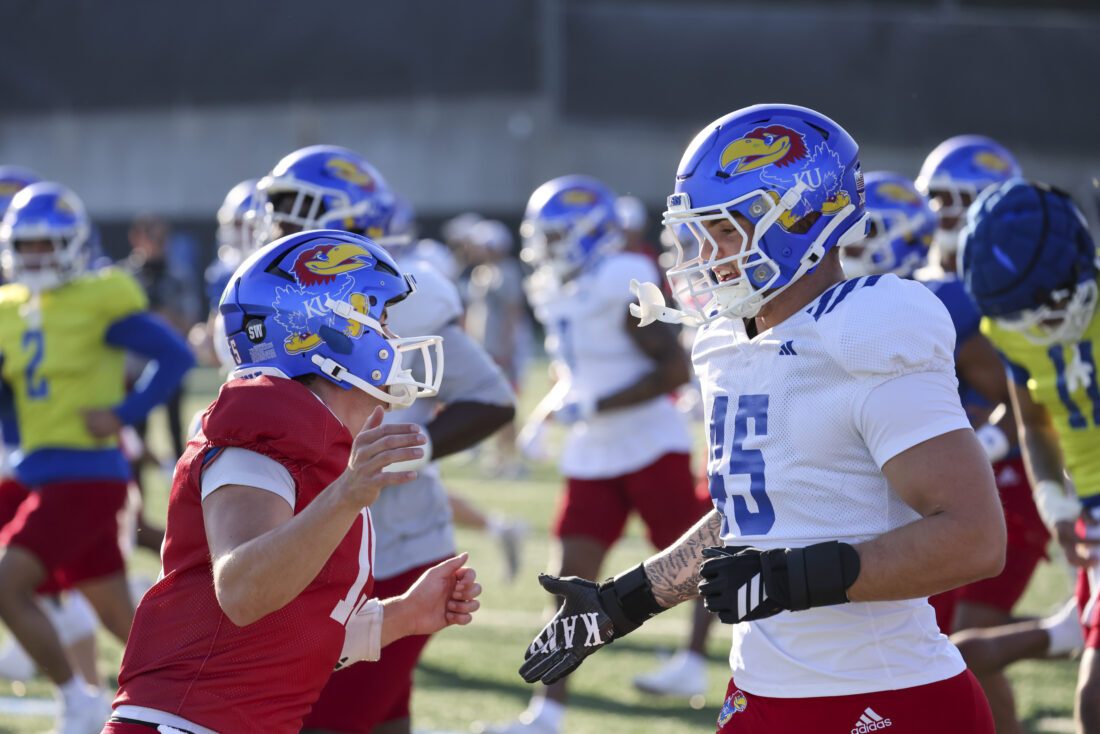 Kansas quarterback Cole Ballard (left) and defensive end Garrett Martin high-five during Kansas football’s spring practice on Thursday, March 26, 2026, in Lawrence.