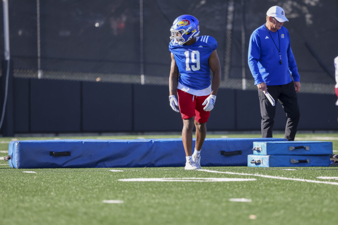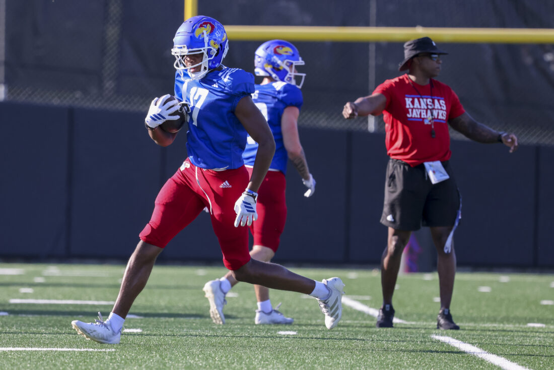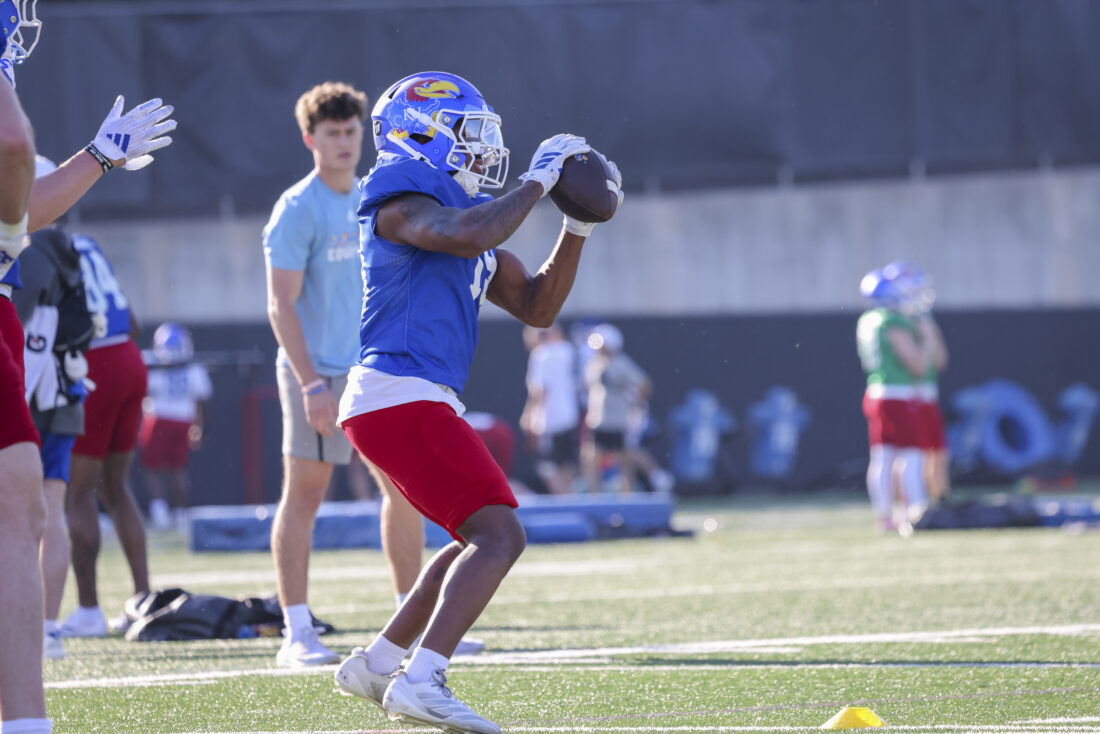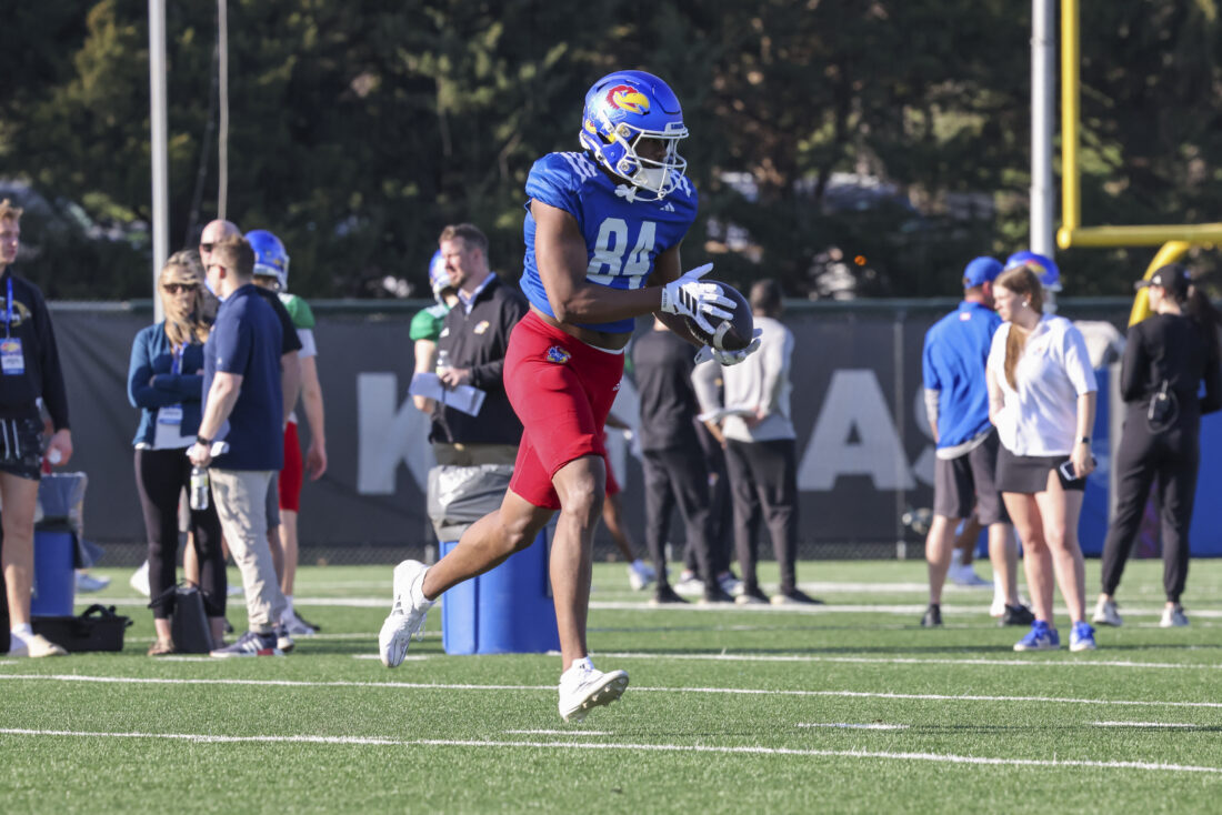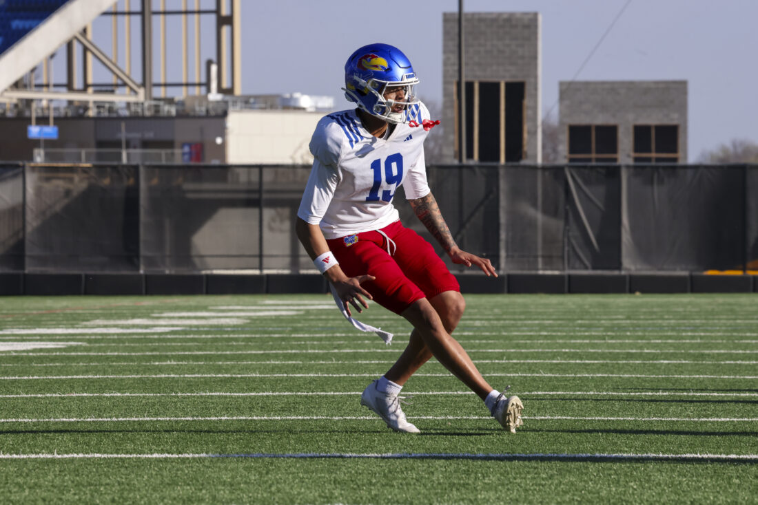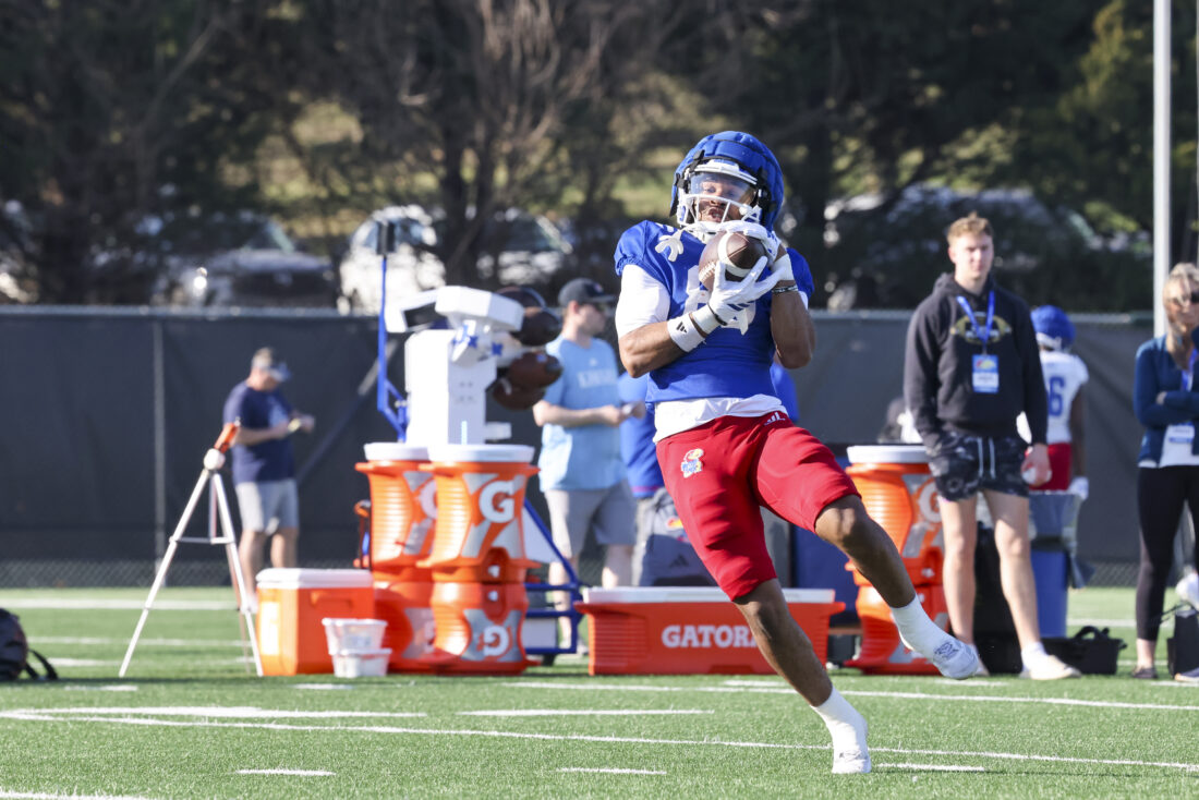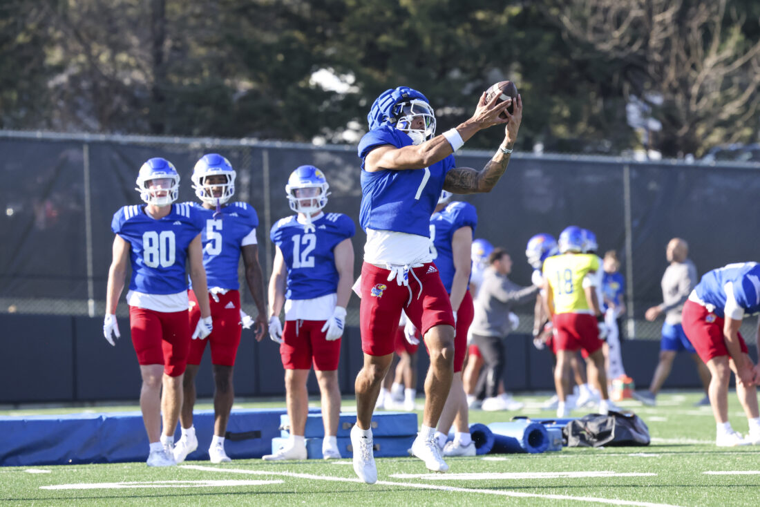 Kansas receiver Donald Collier participates in Kansas football’s spring practice on Thursday, March 26, 2026, in Lawrence.