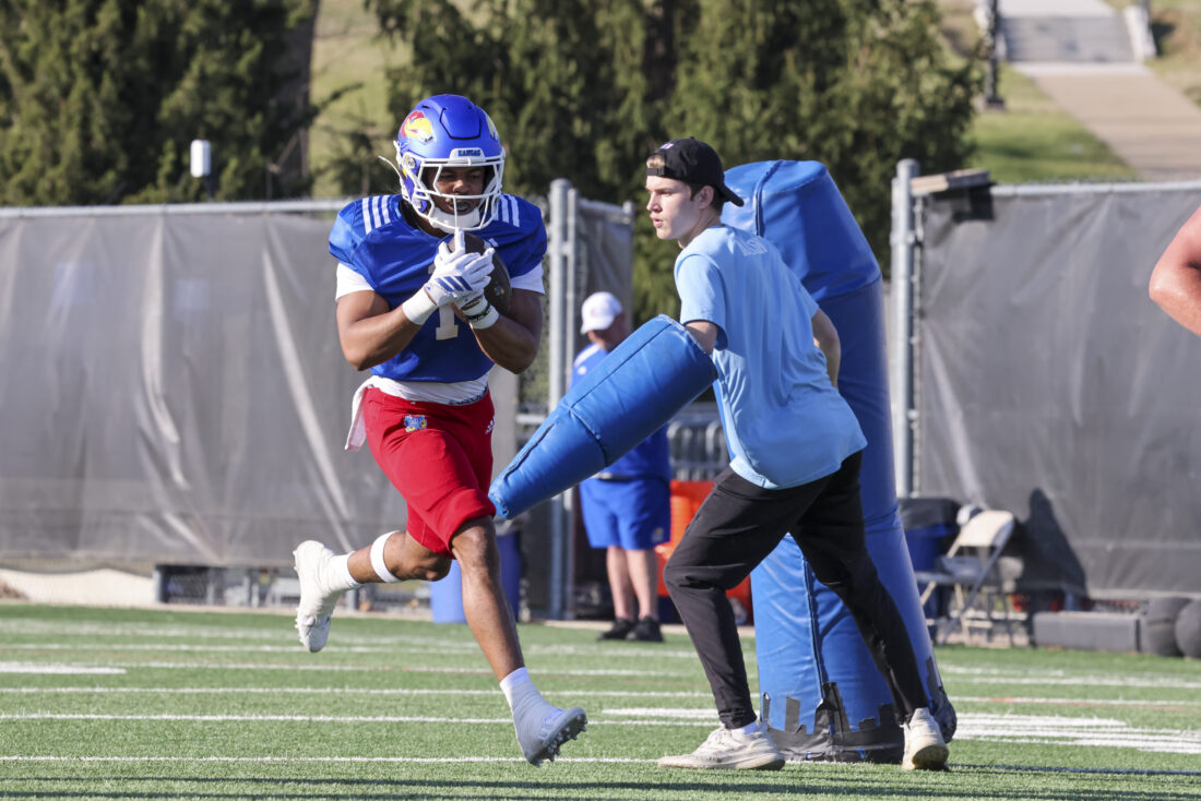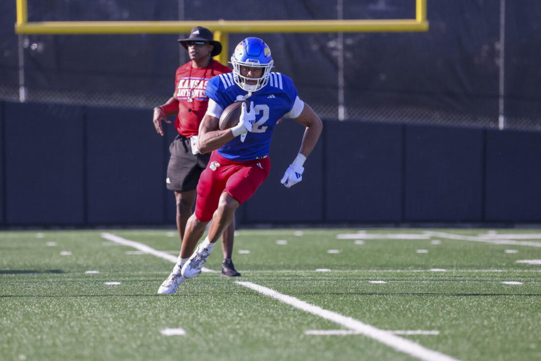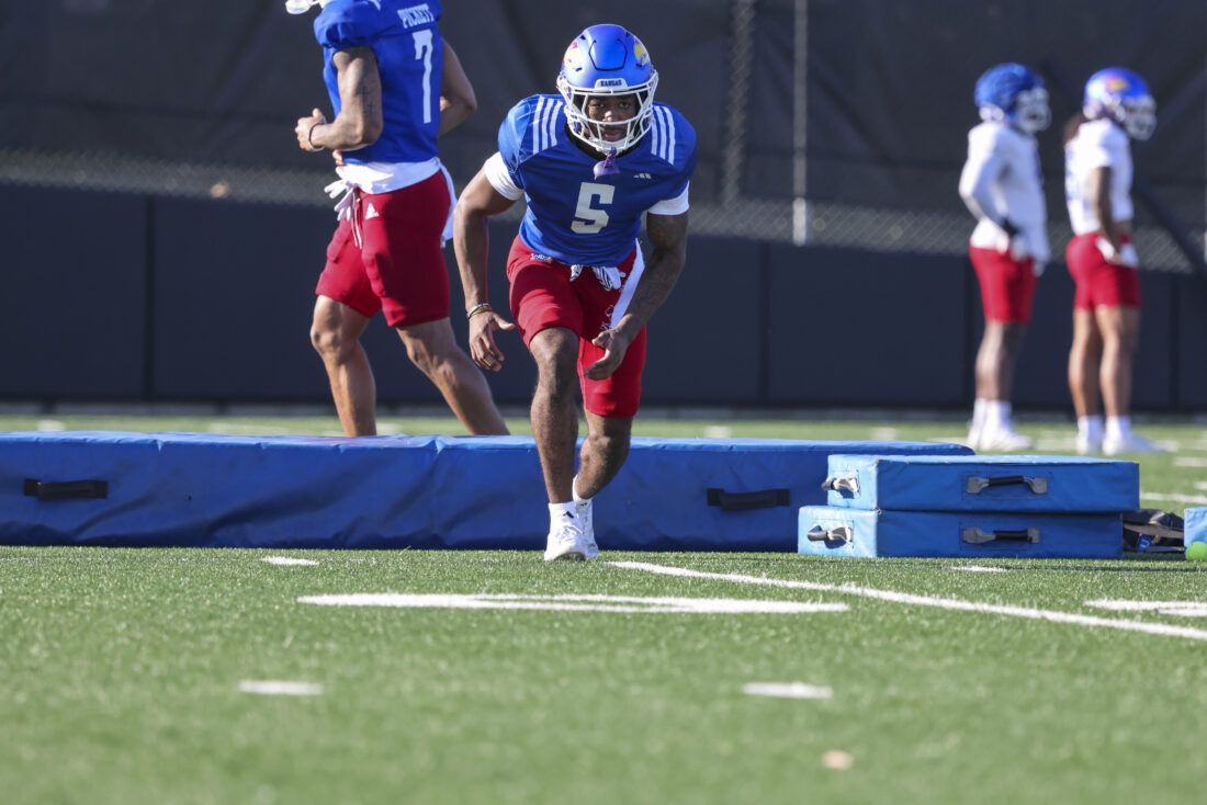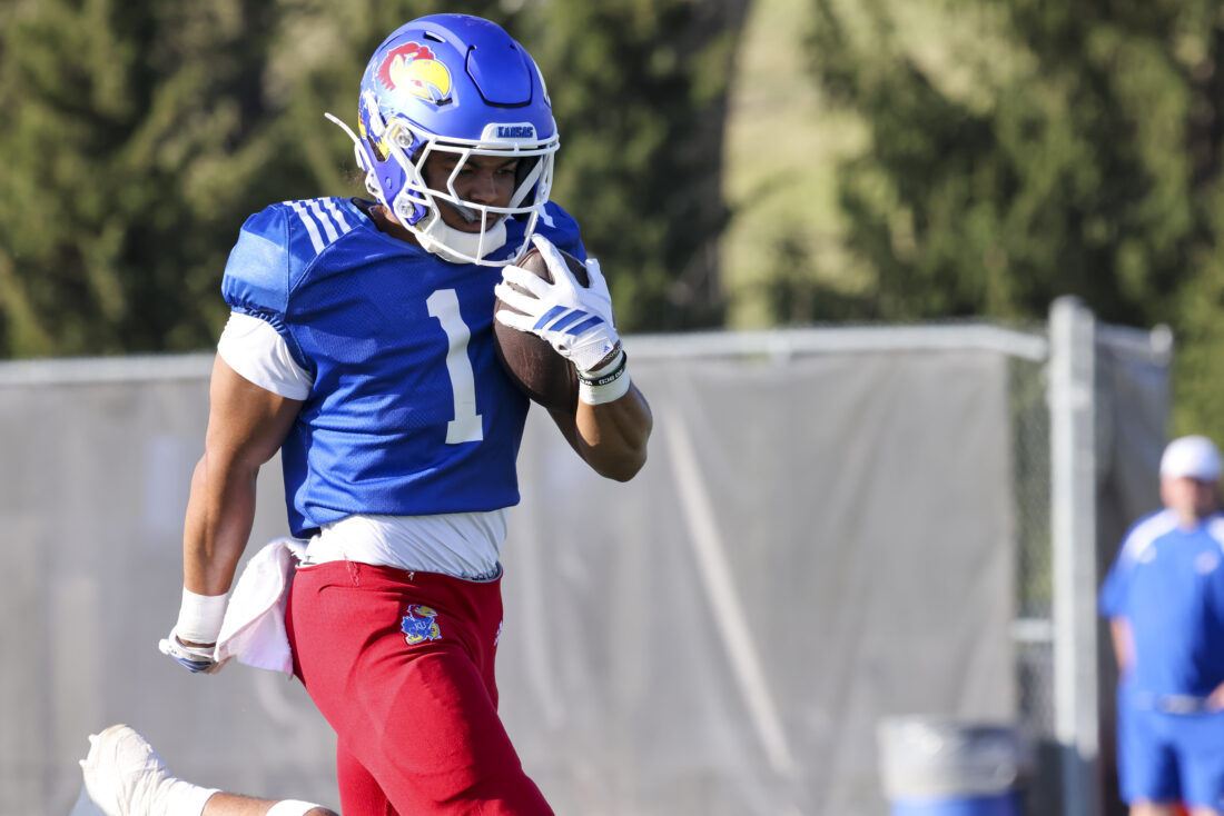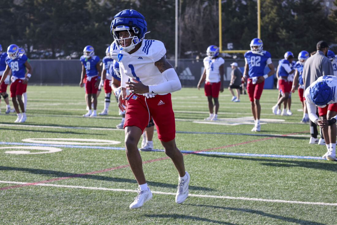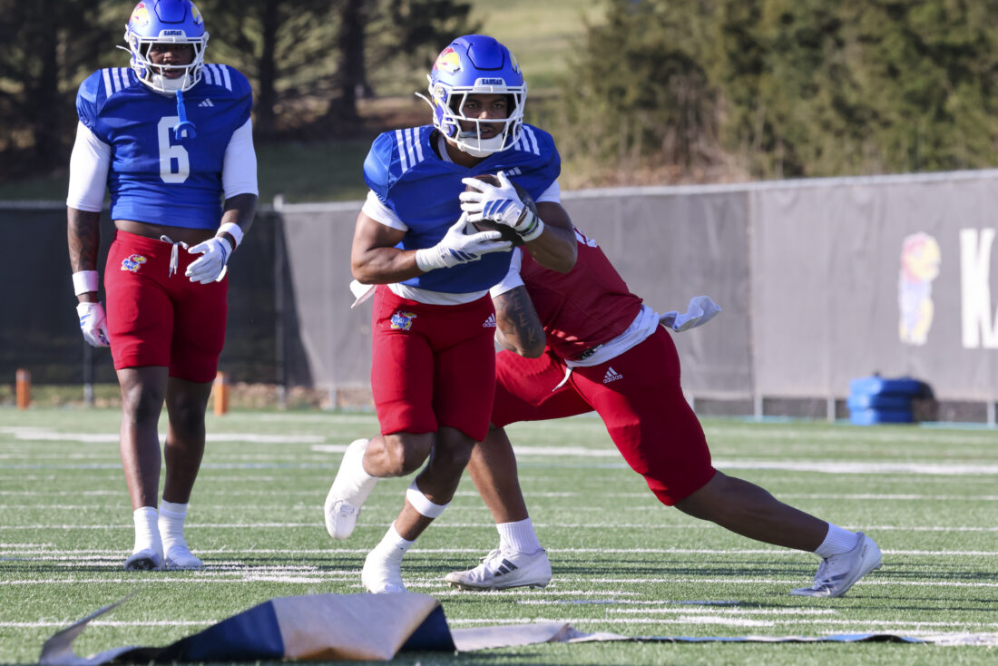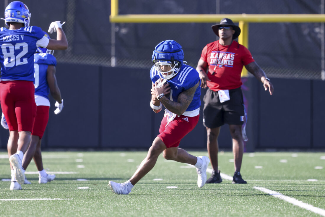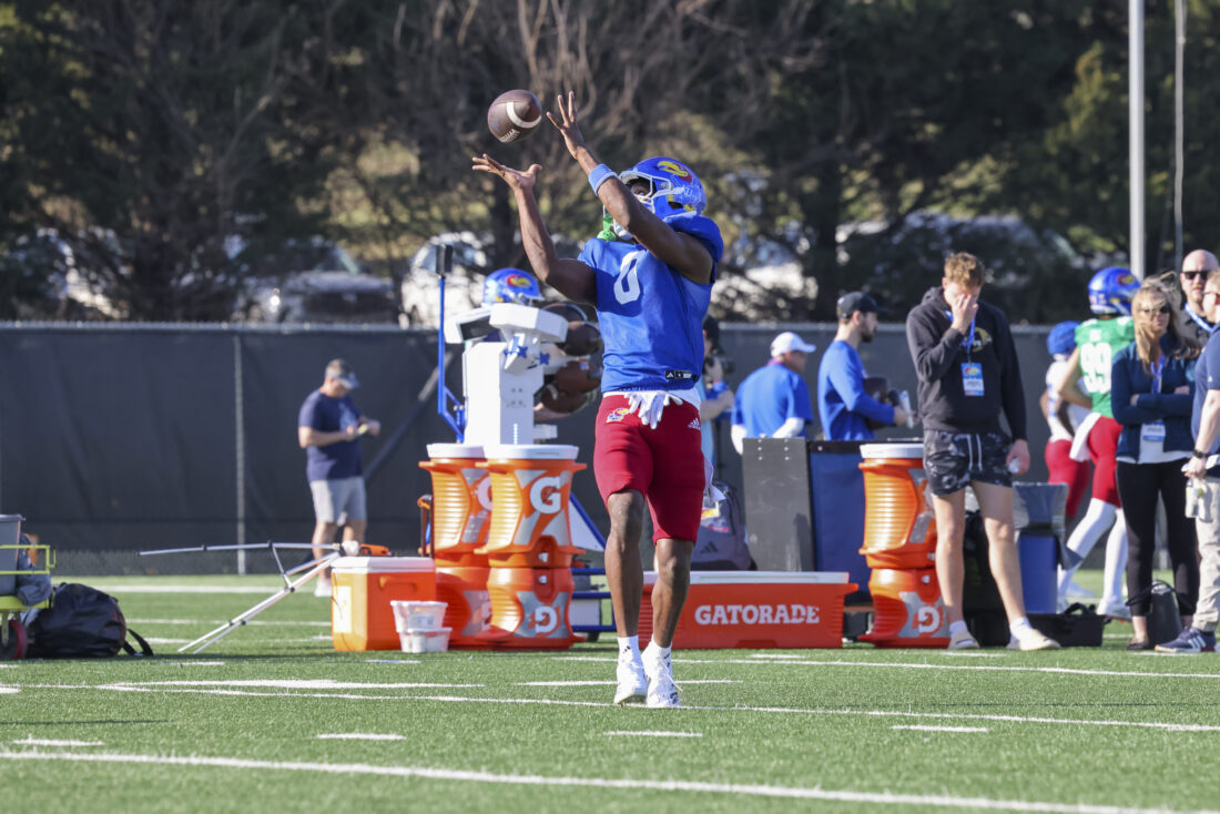 Kansas receiver Donald Collier participates in Kansas football’s spring practice on Thursday, March 26, 2026, in Lawrence.