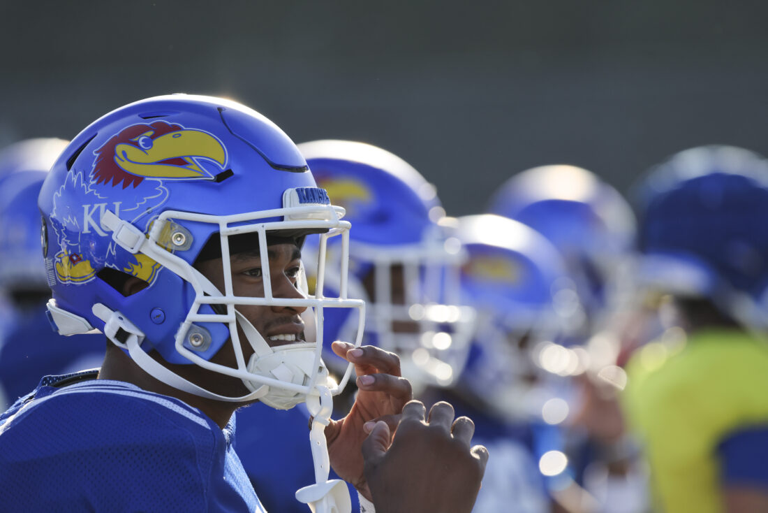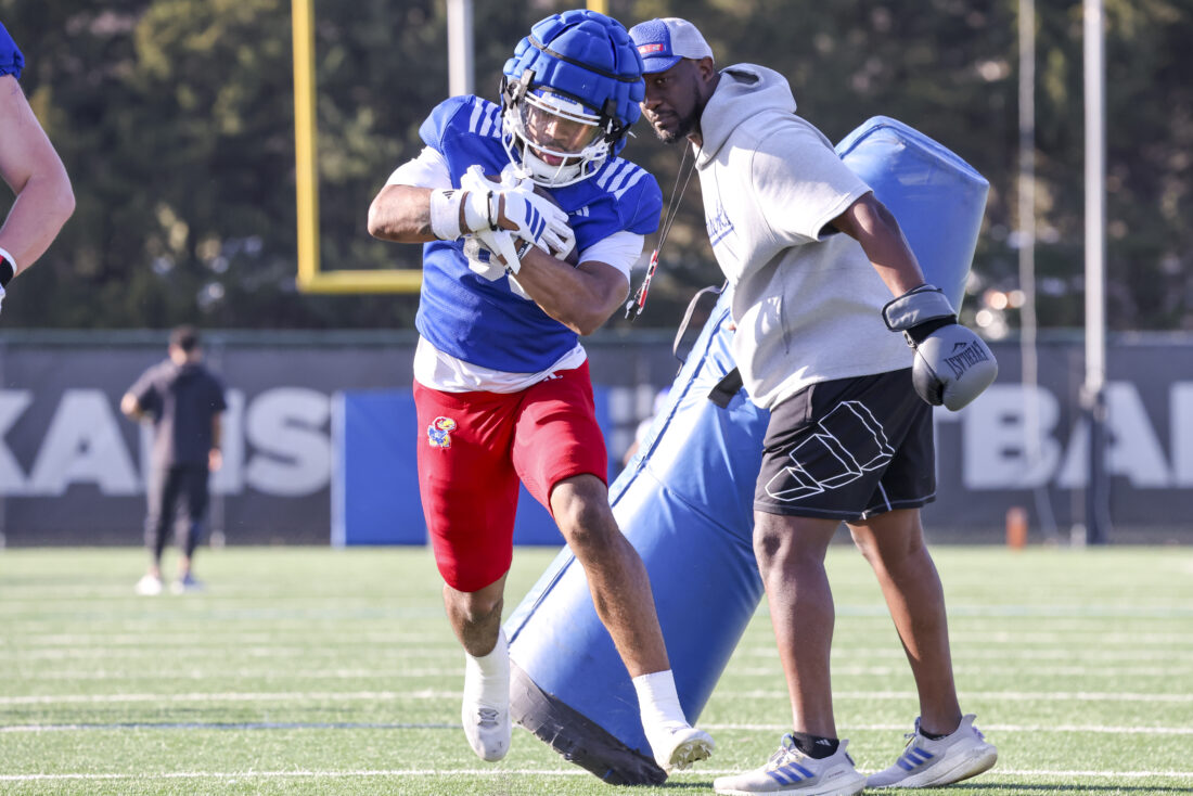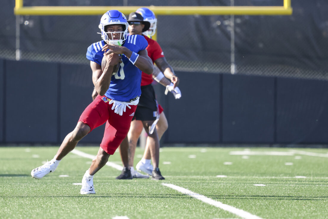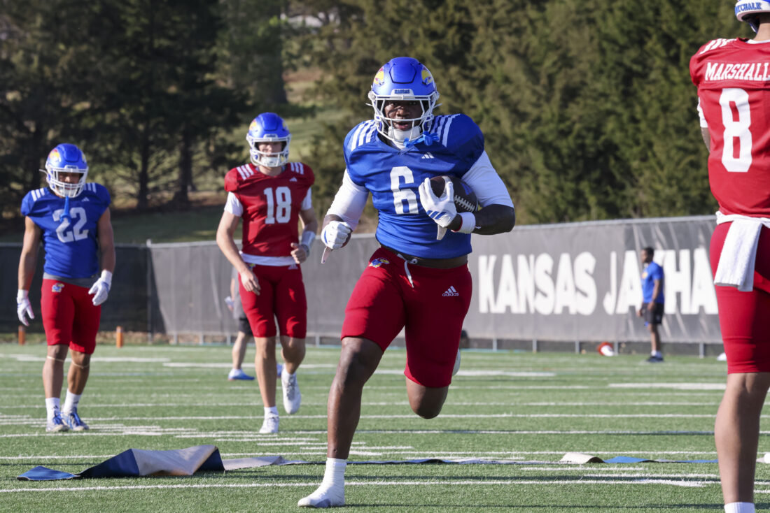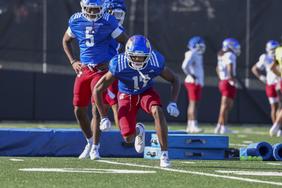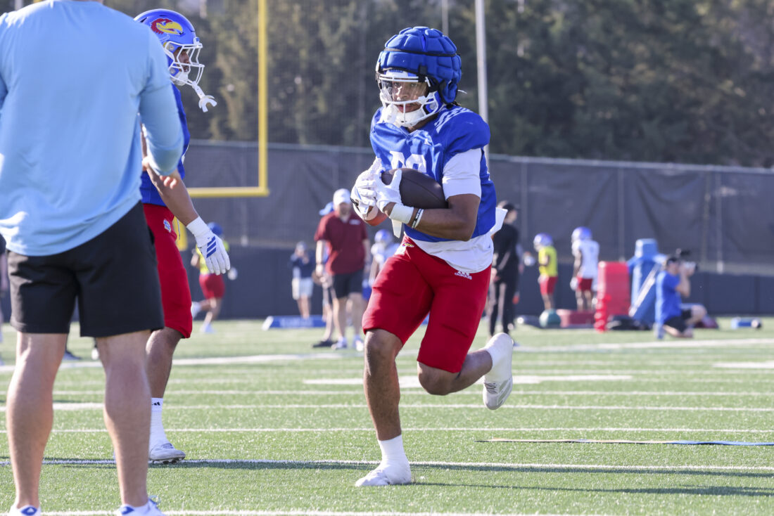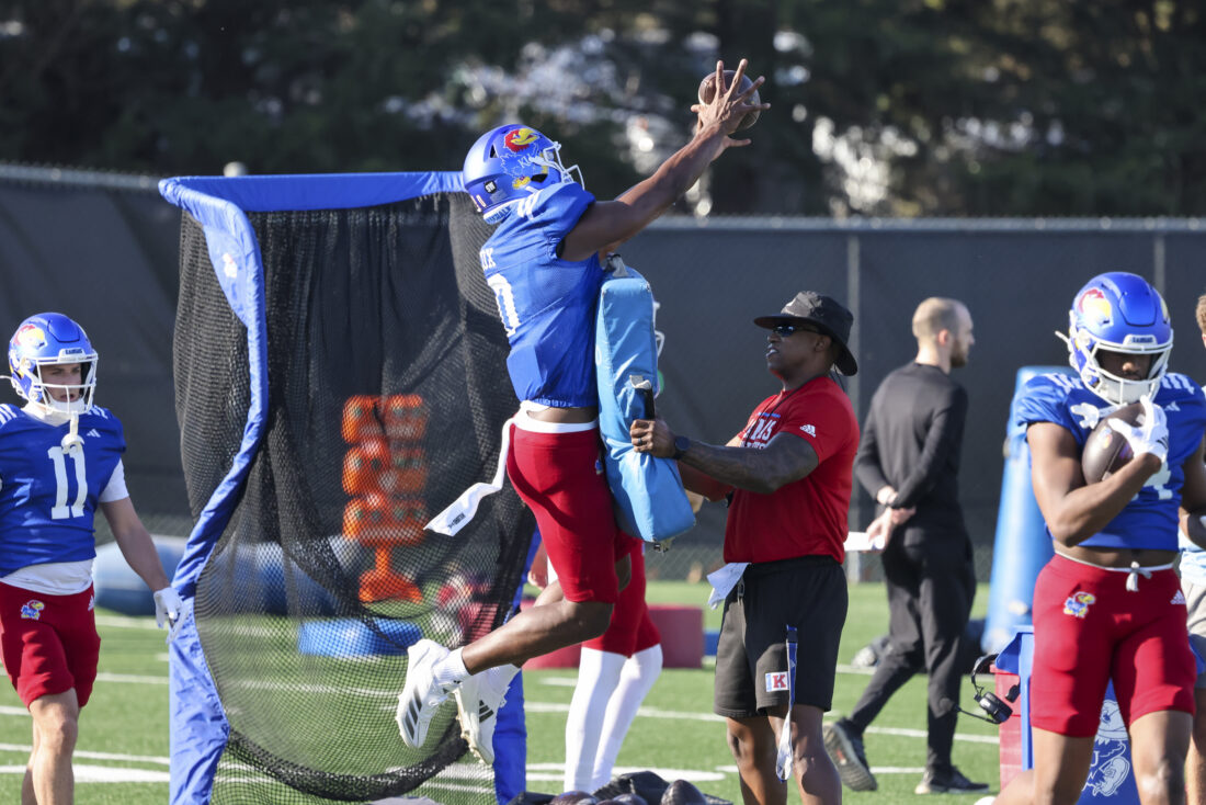 Kansas receiver Donald Collier participates in Kansas football’s spring practice on Thursday, March 26, 2026, in Lawrence.