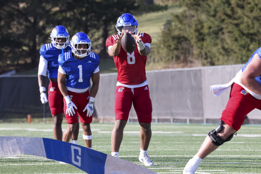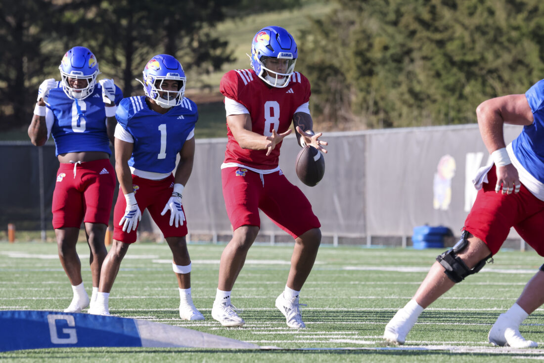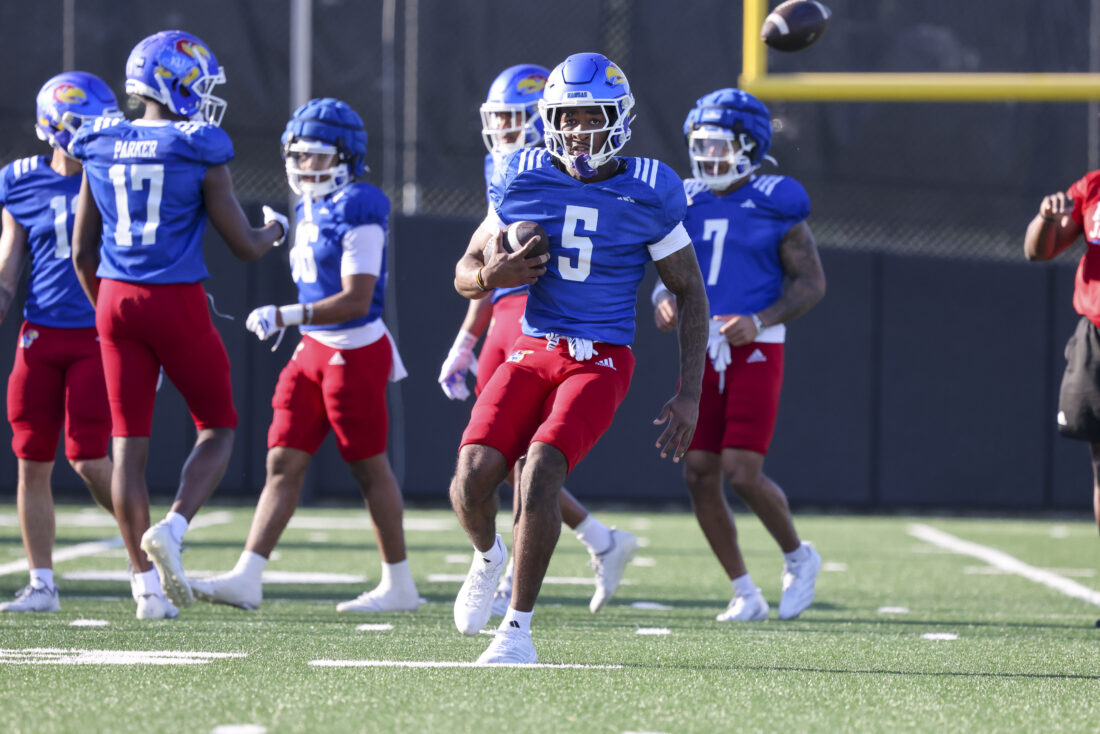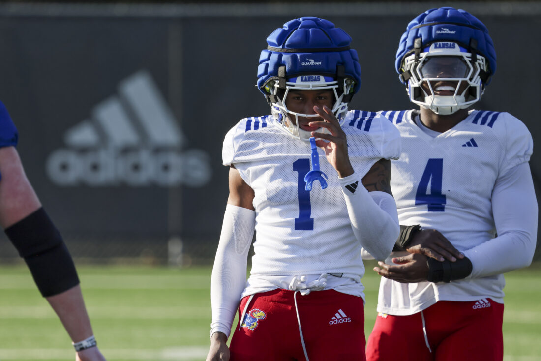 Kansas quarterback Braylen Rooney (left) and running back Micah Johnson participate in Kansas football’s spring practice on Thursday, March 26, 2026, in Lawrence.