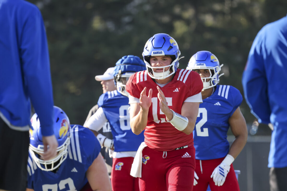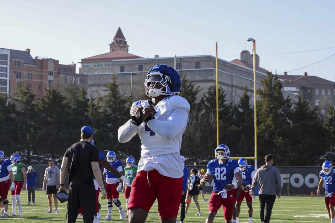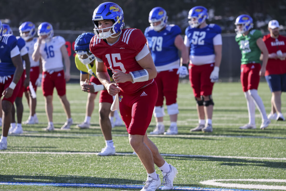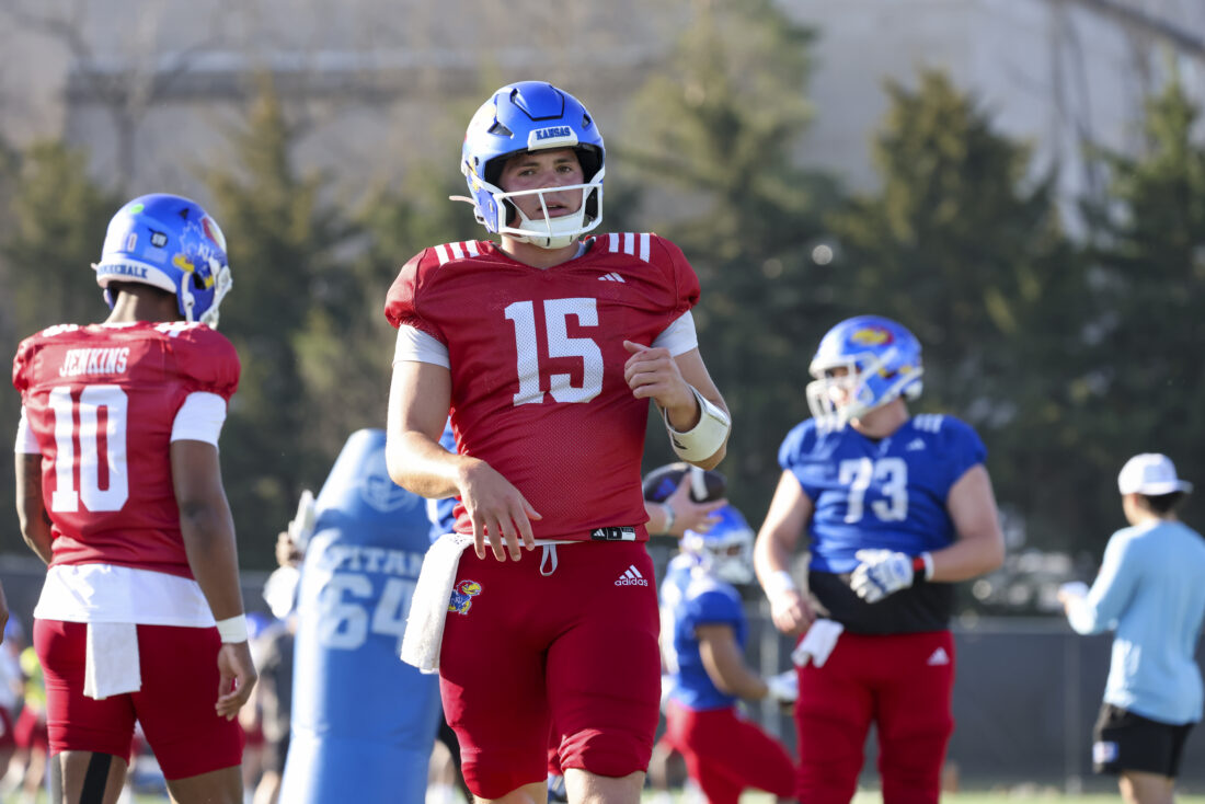 Kansas quarterback Chase Jenkins participates in Kansas football’s spring practice on Thursday, March 26, 2026, in Lawrence.