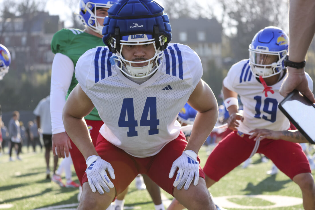 Kansas linebacker Trey Lathan participates in Kansas football’s spring practice on Thursday, March 26, 2026, in Lawrence.