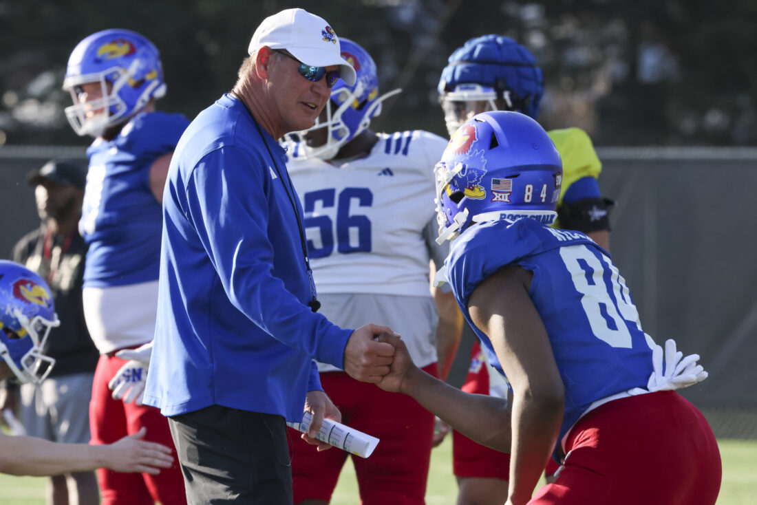 Kansas head coach Lance Leipold (left) shakes hands with receiver Jaden Nickens during Kansas football’s spring practice on Thursday, March 26, 2026, in Lawrence.