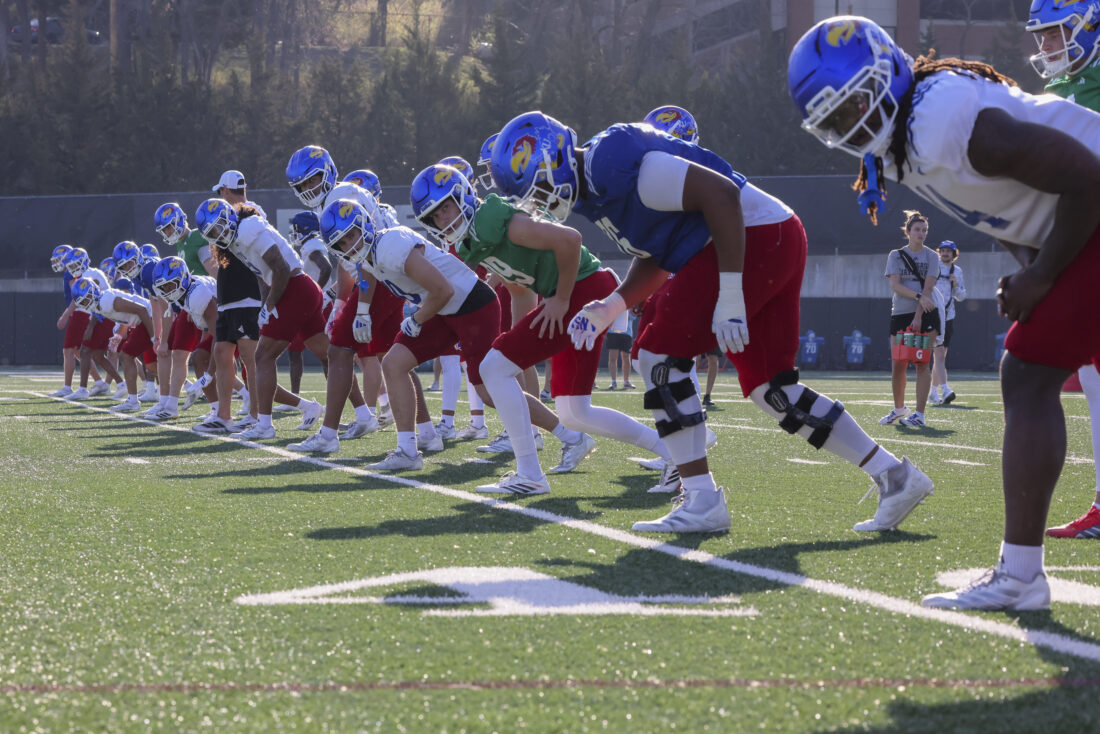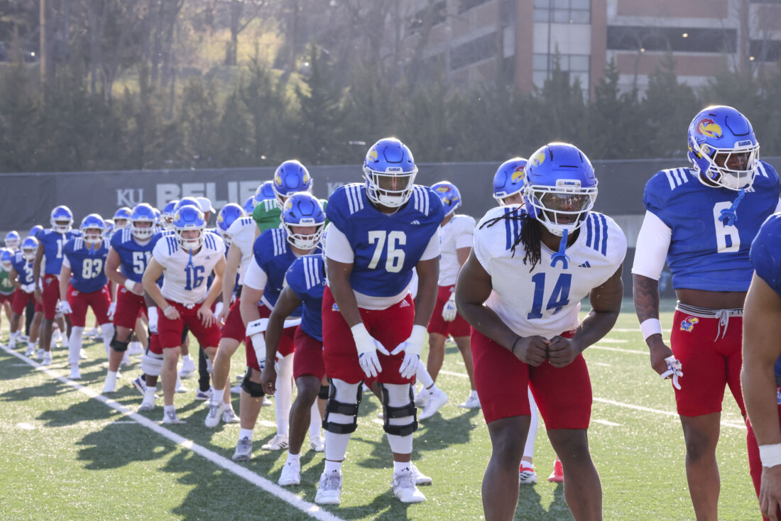 The Kansas football team lines up during their spring practice on Thursday, March 26, 2026, in Lawrence.