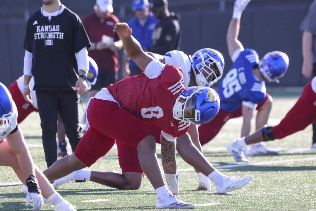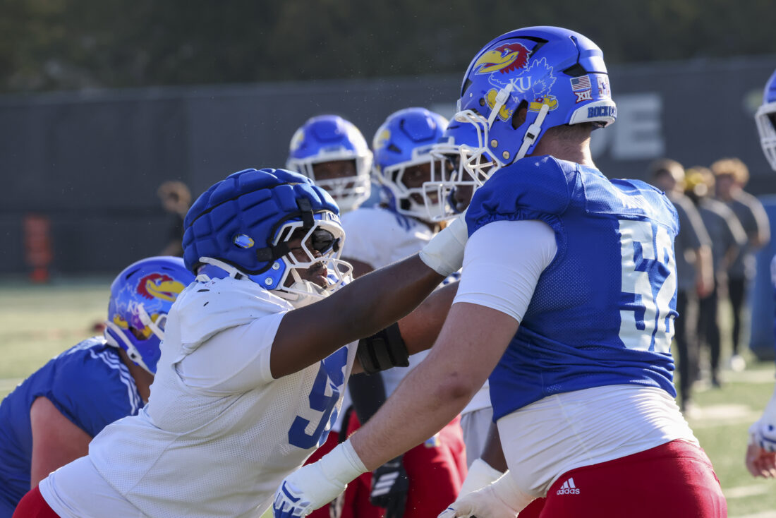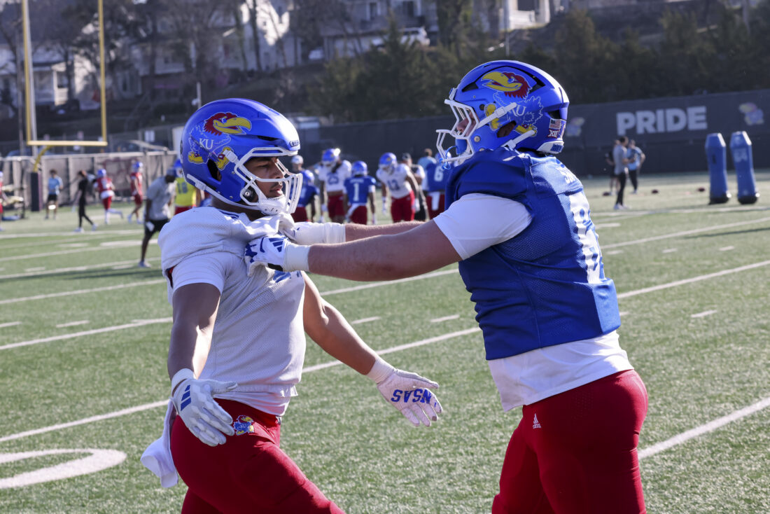 Kansas defensive end Adrian Holley (left) and offensive lineman Kaden Snyder participate in Kansas football’s spring practice on Thursday, March 26, 2026, in Lawrence.