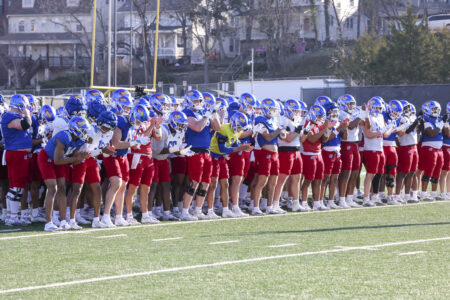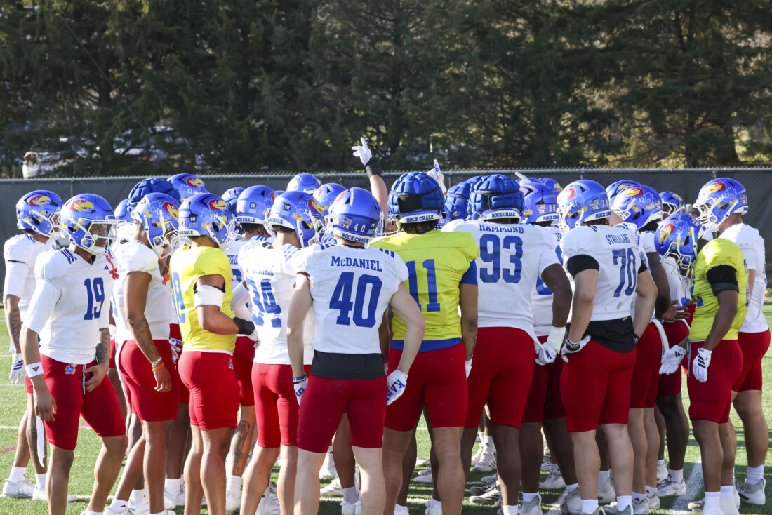 The Kansas football team huddles during their spring practice on Thursday, March 26, 2026, in Lawrence.