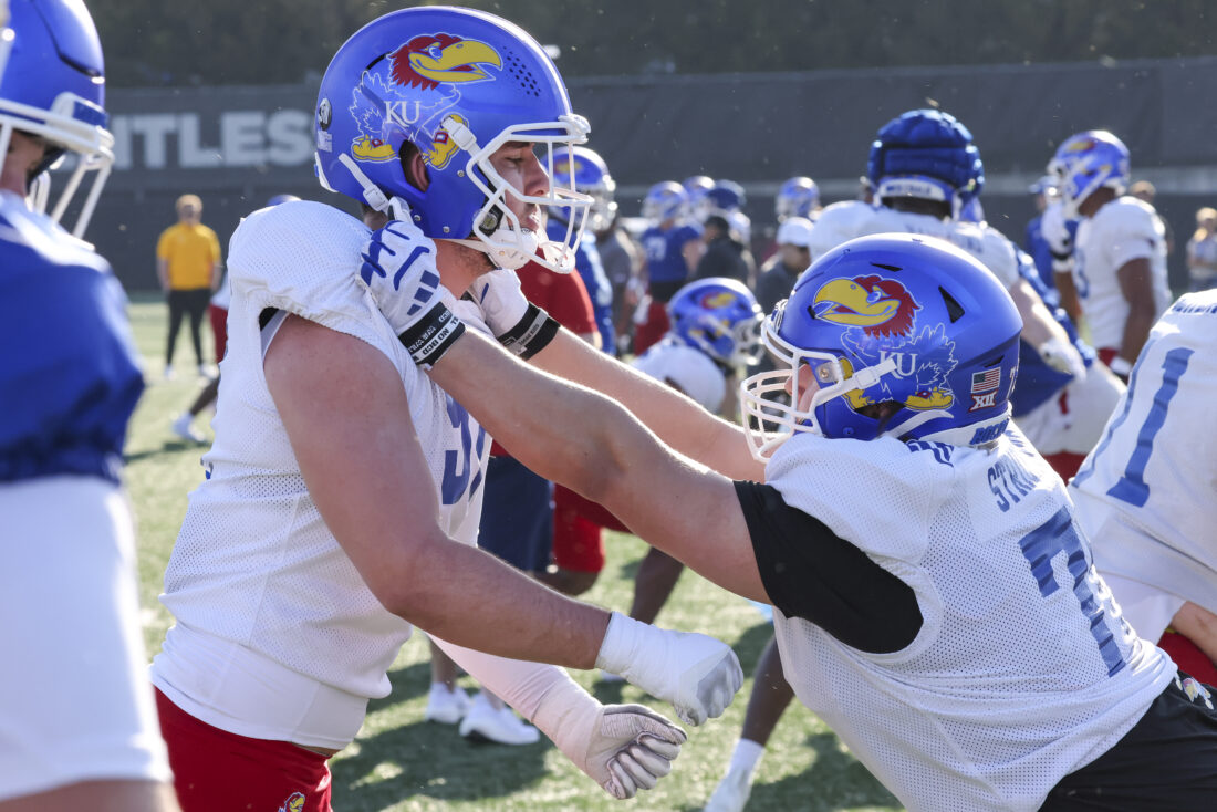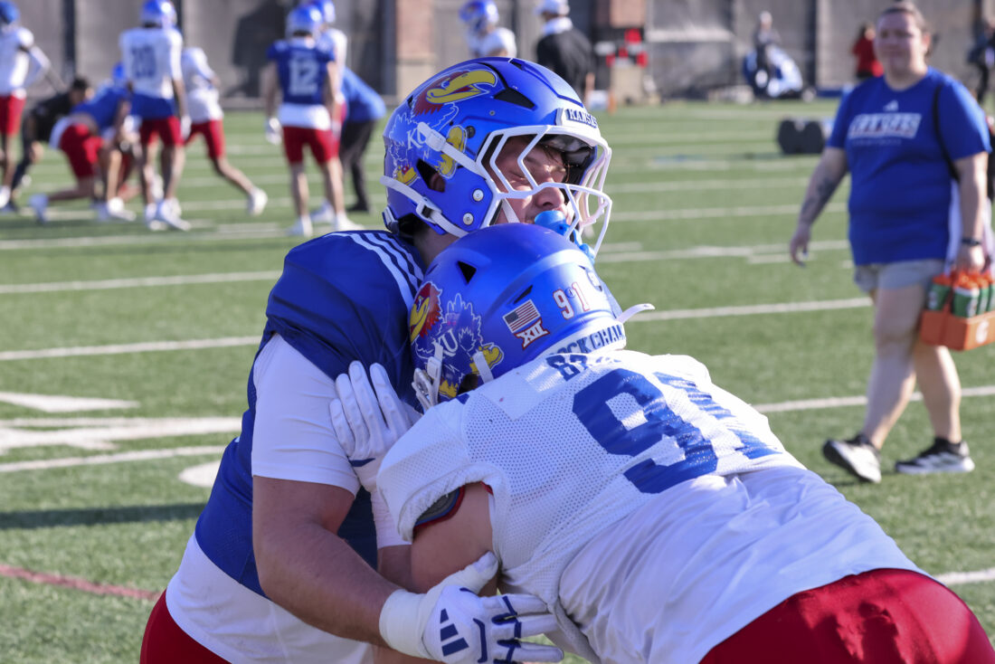 Kansas offensive lineman Kaden Snyder (left) and defensive lineman Alex Bray participate in Kansas football’s spring practice on Thursday, March 26, 2026, in Lawrence.