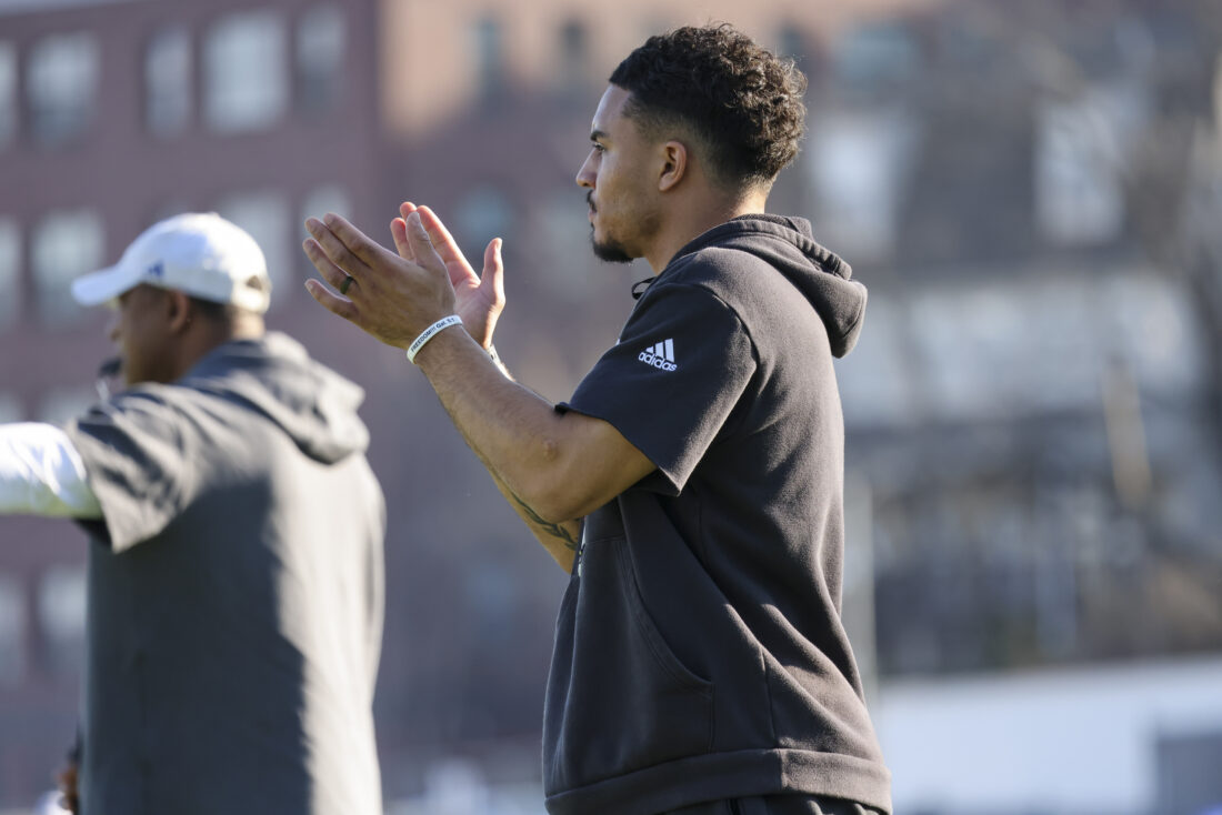 Kansas defensive analyst Bryce Torneden claps during Kansas football’s spring practice on Thursday, March 26, 2026, in Lawrence.