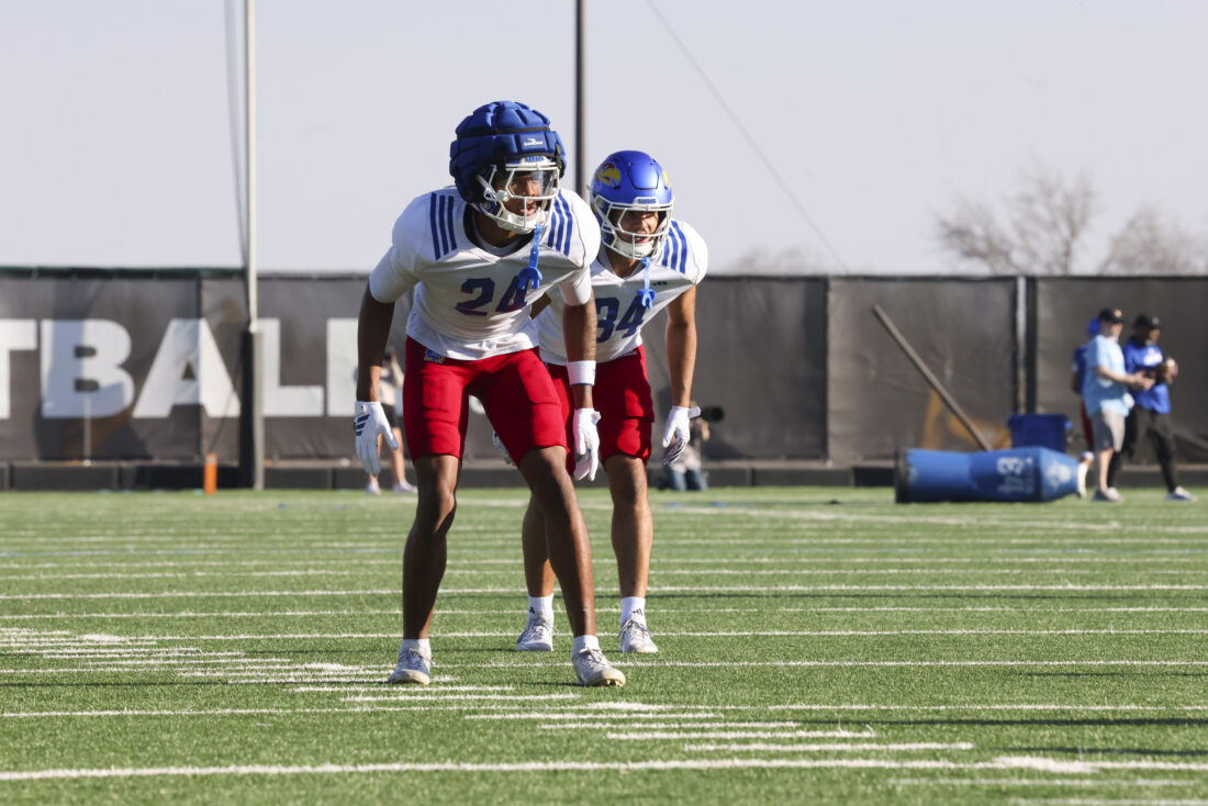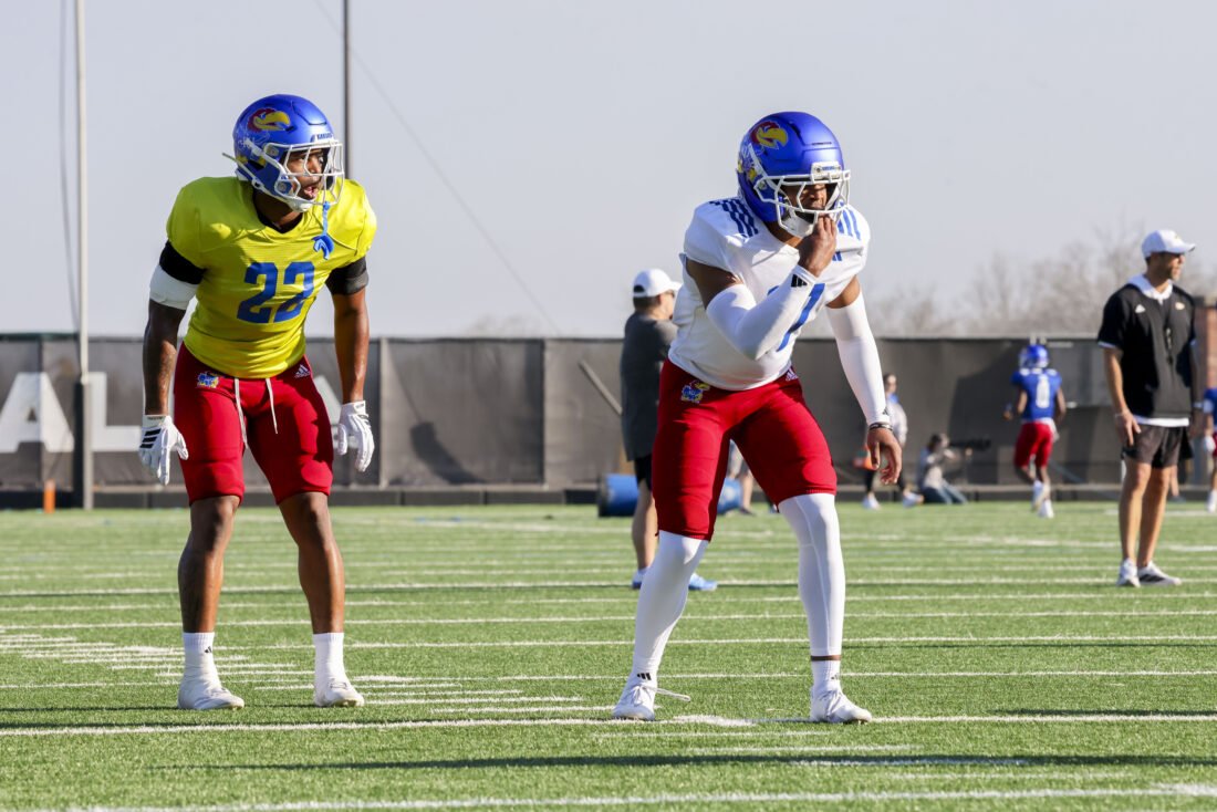 Kansas safety Khijohnn Cummings-Coleman (left) and cornerback Trey Brown III participate in Kansas football’s spring practice on Thursday, March 26, 2026, in Lawrence.