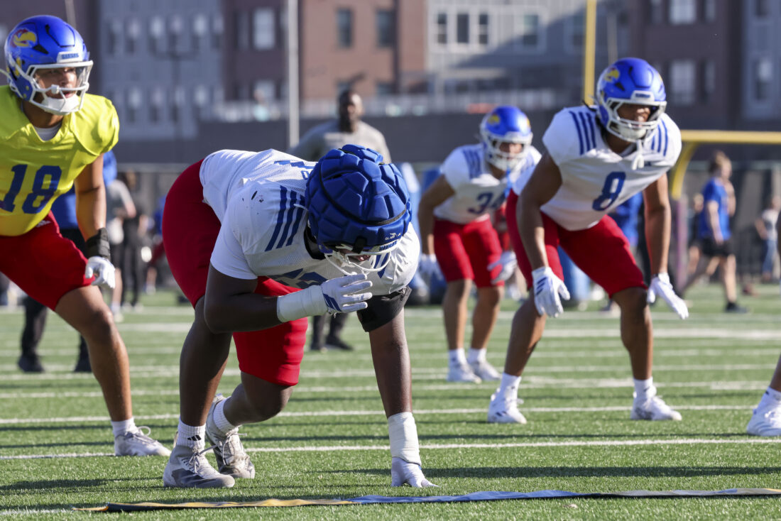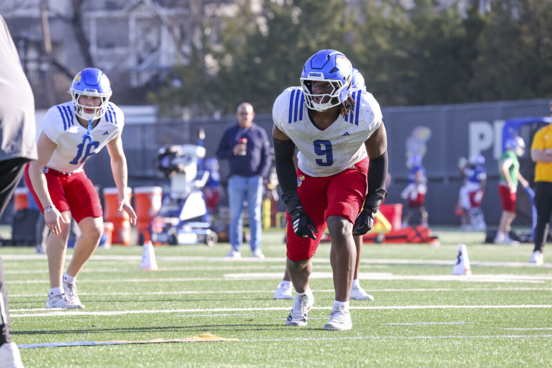 Kansas defensive end David Santiago participates in Kansas football’s spring practice on Thursday, March 26, 2026, in Lawrence.