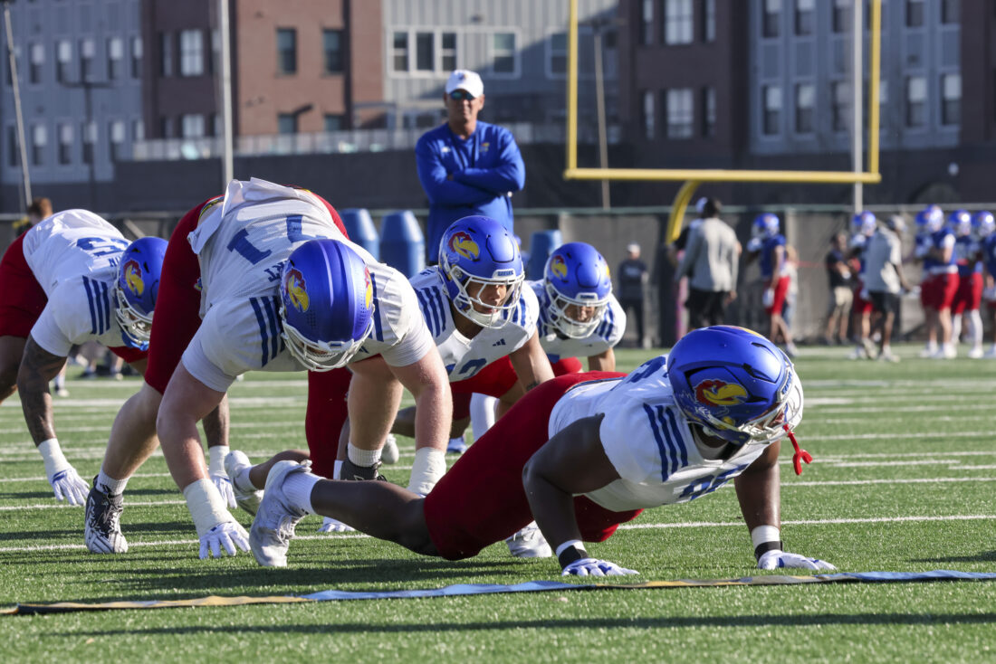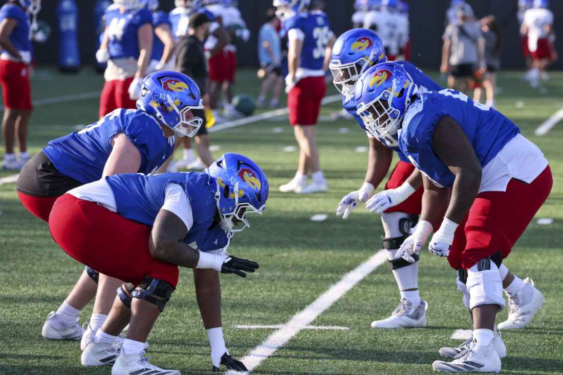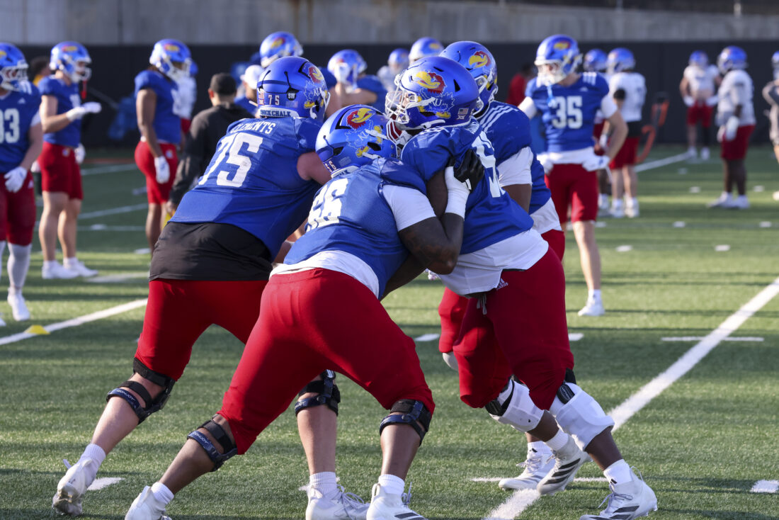 Kansas offensive linemen participate in Kansas football’s spring practice on Thursday, March 26, 2026, in Lawrence.