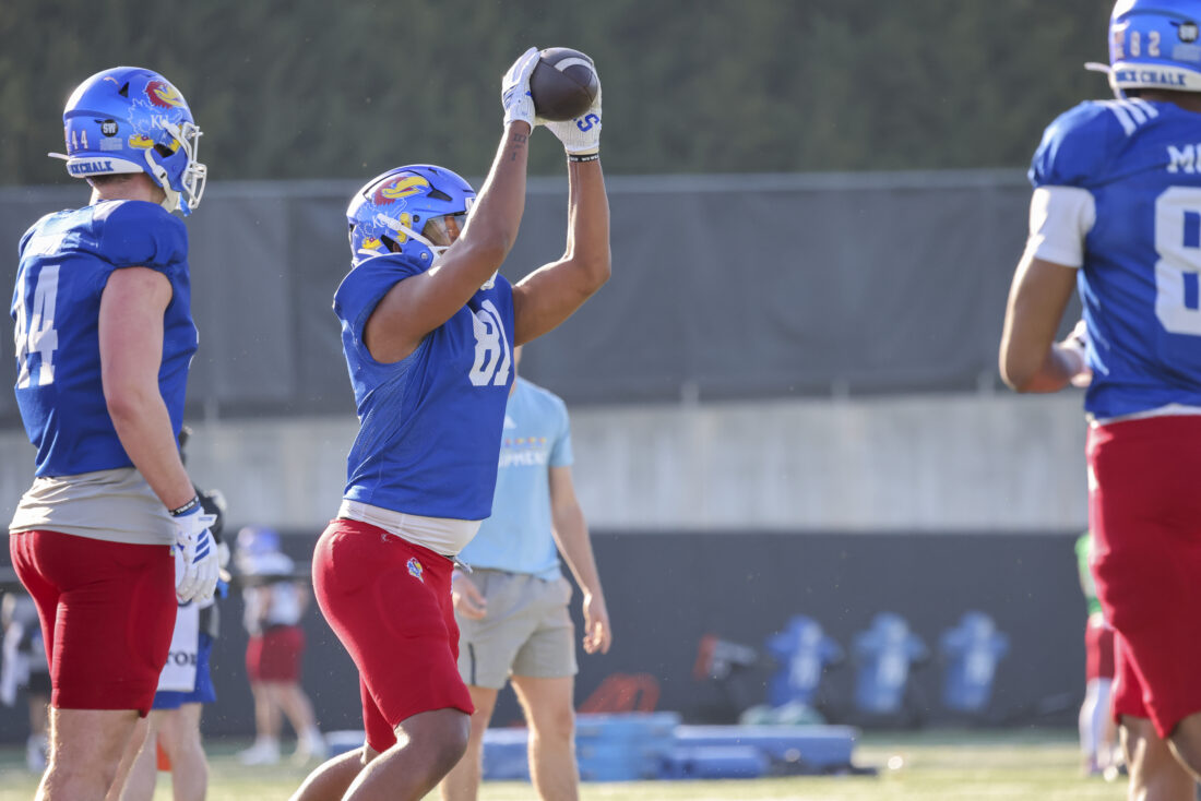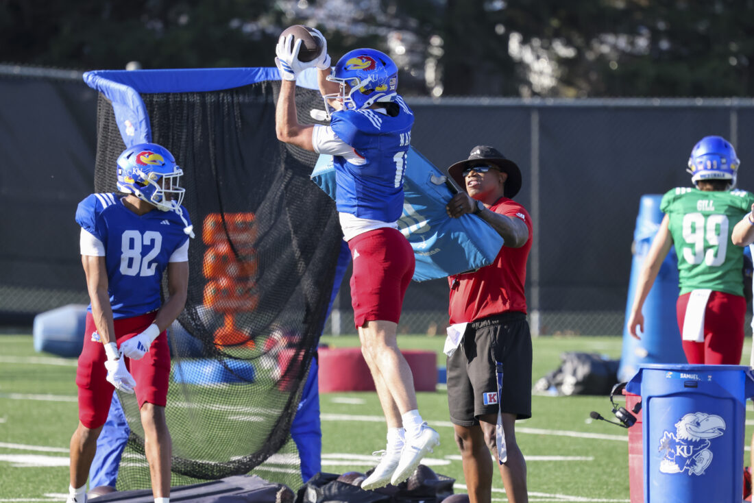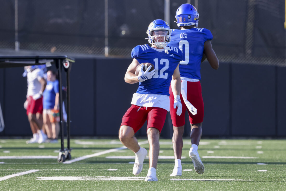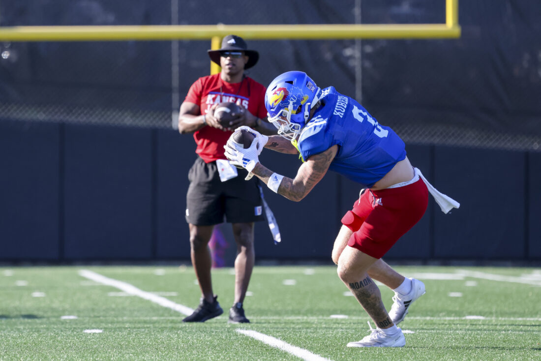 Kansas receiver Keaton Kubecka participates in Kansas football’s spring practice on Thursday, March 26, 2026, in Lawrence.