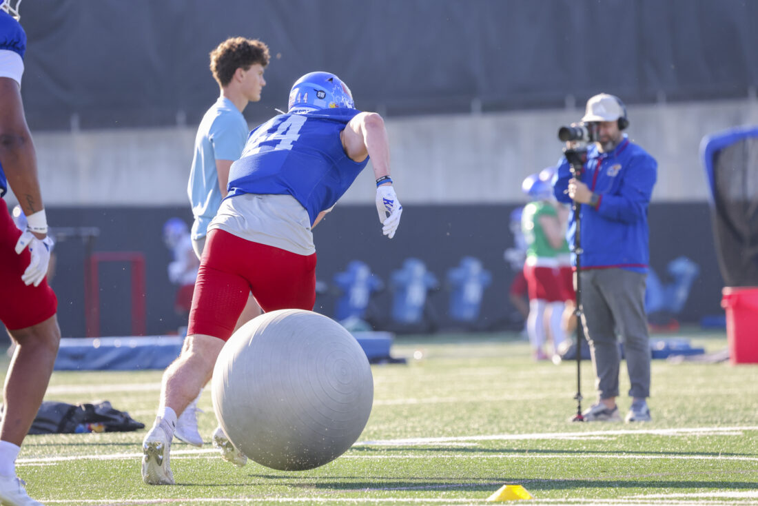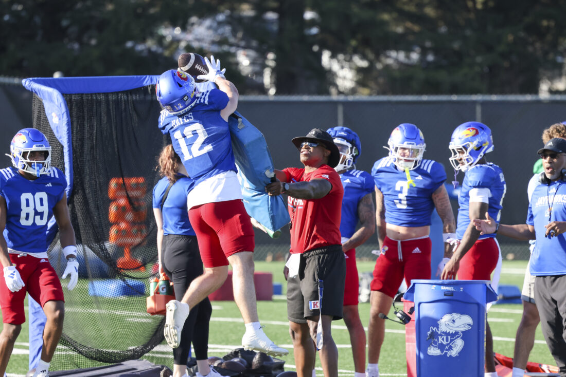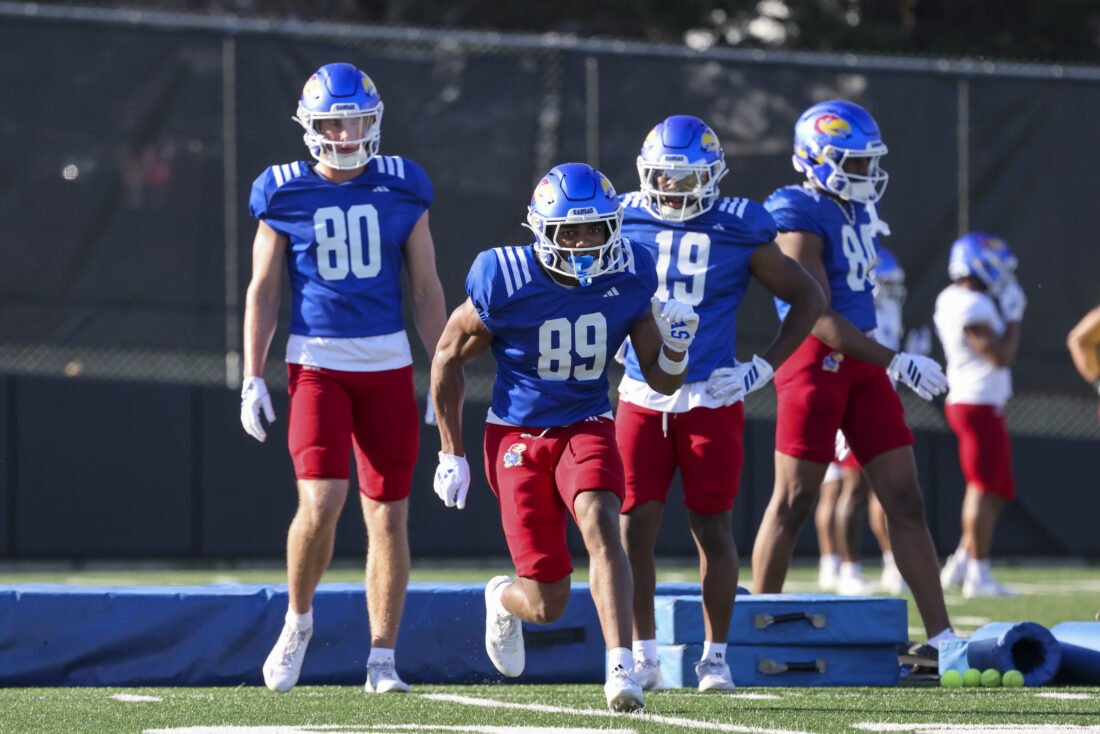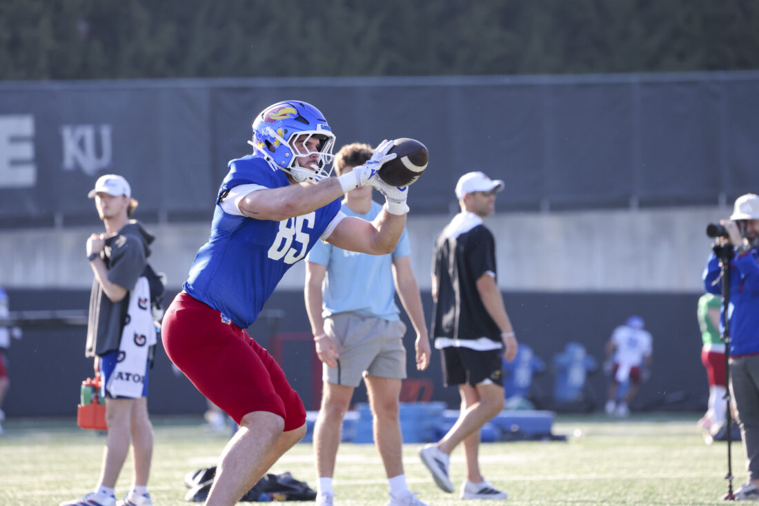 Kansas receiver Keaton Kubecka participates in Kansas football’s spring practice on Thursday, March 26, 2026, in Lawrence.