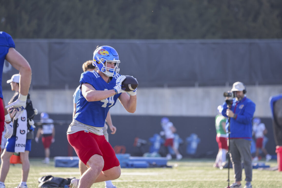 Kansas tight end Carson Bruhn participates in Kansas football’s spring practice on Thursday, March 26, 2026, in Lawrence.