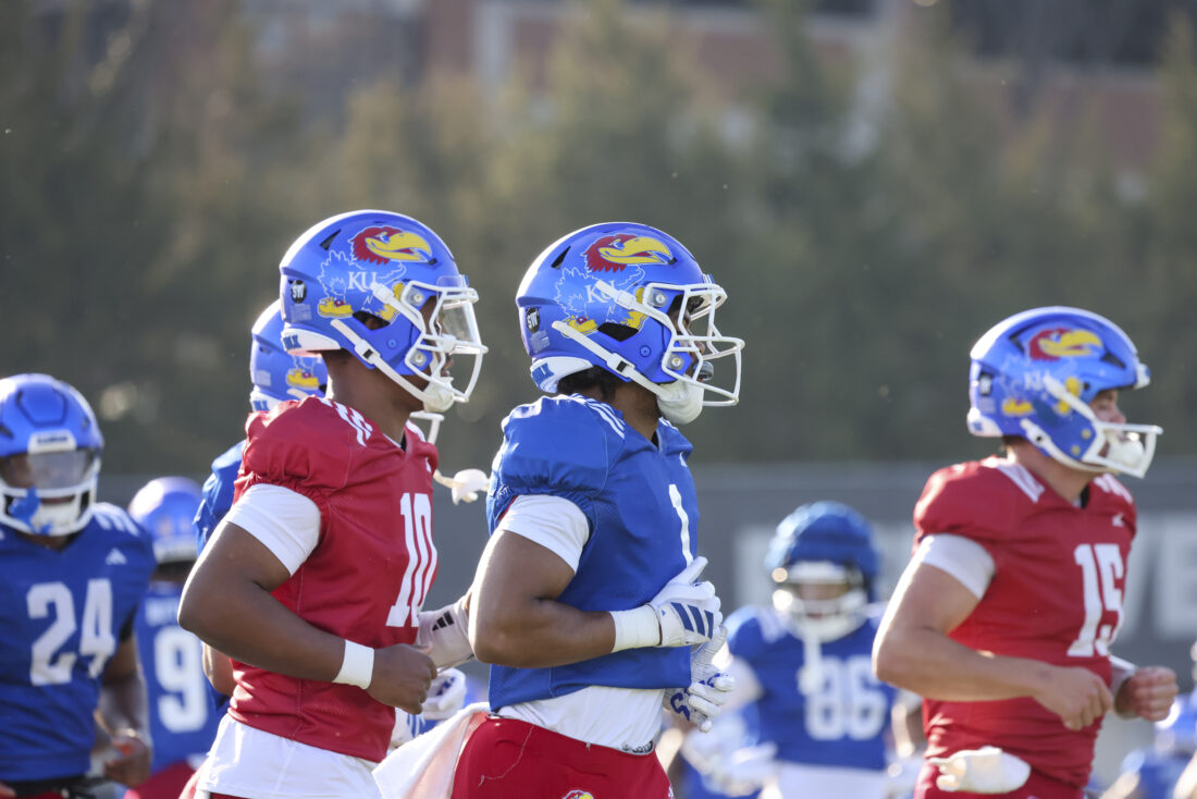 The Kansas offense runs to a drill during Kansas football’s spring practice on Thursday, March 26, 2026, in Lawrence.