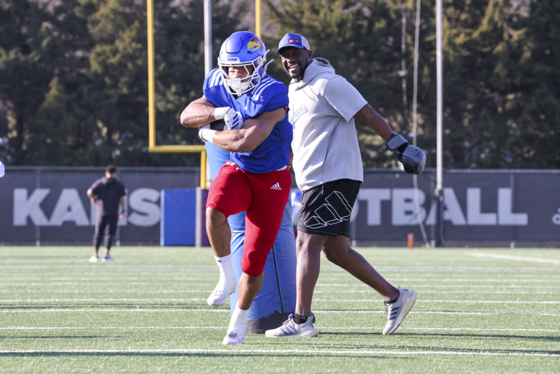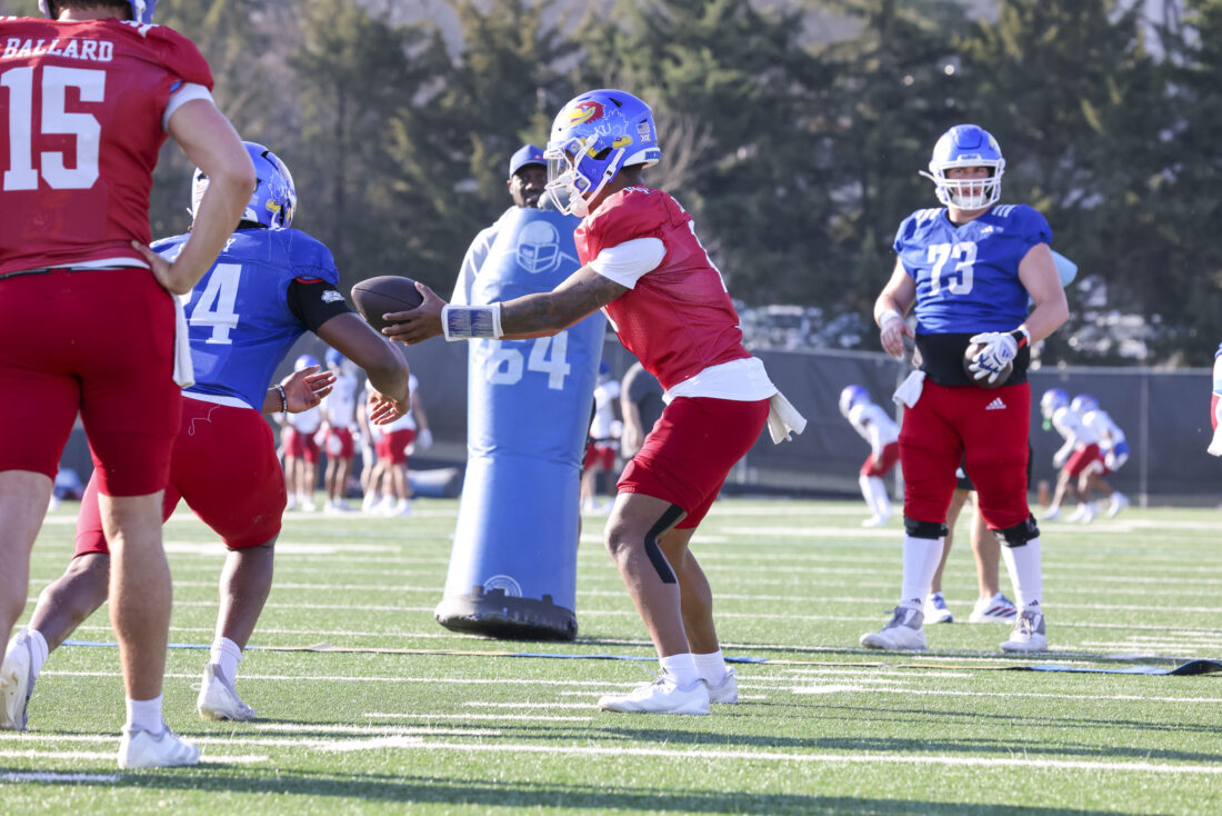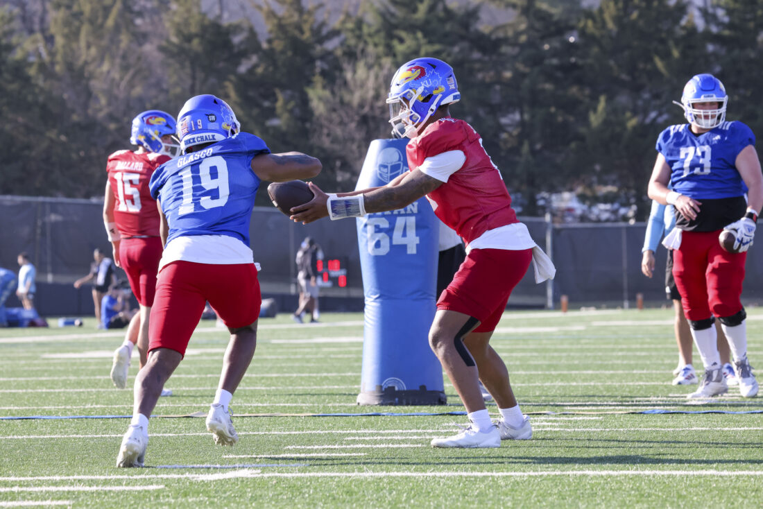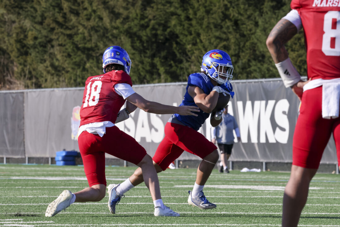 Kansas running back Micah Johnson (left) and quarterback Cole Ballard participate in Kansas football’s spring practice on Thursday, March 26, 2026, in Lawrence.