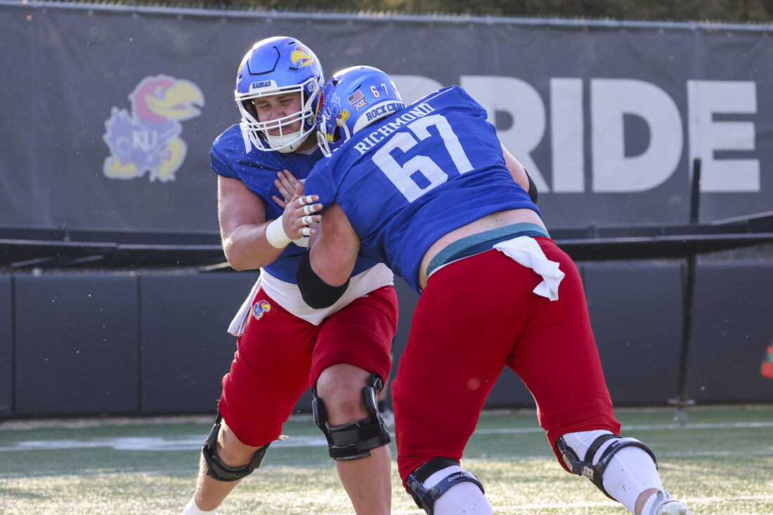 Kansas offensive linemen Eli Richmond (front) and Kasen Carpenter participate in Kansas football’s spring practice on Thursday, March 26, 2026, in Lawrence.