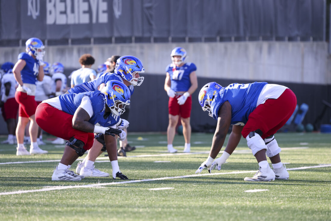 Kansas offensive linemen Nick Morrow, James Livingston, and Jack Tanner (left to right) participate in Kansas football’s spring practice on Thursday, March 26, 2026, in Lawrence.